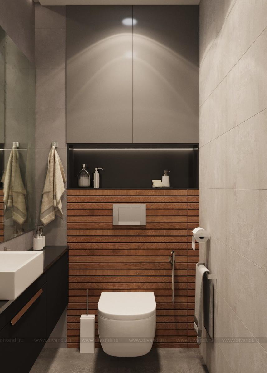 Ванная комната и гостевой санузел в сдержанной цветовой гамме, с применением природных фактур -дерева и камня.