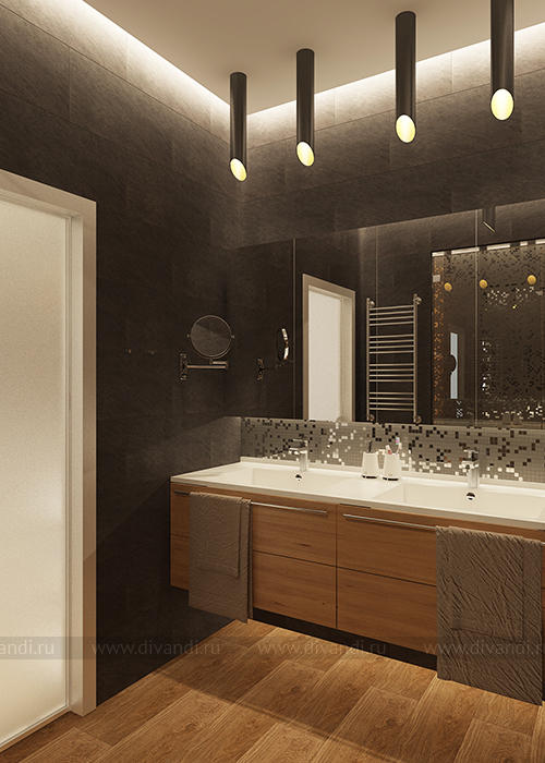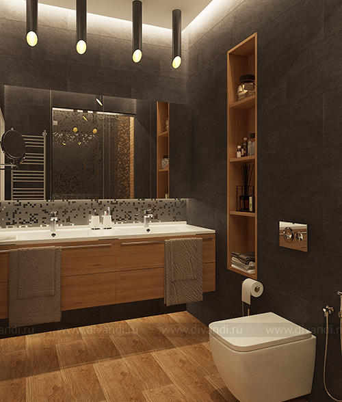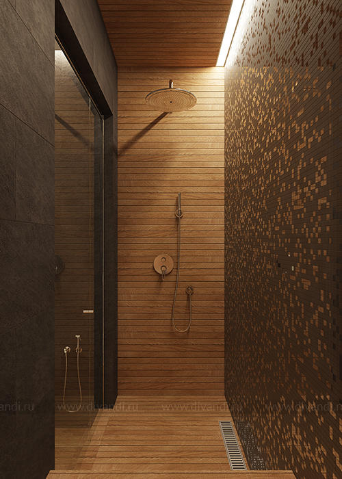 Ванная комната, она же душевая. Выстроена на контрасте теплого дерева и темного камня!
