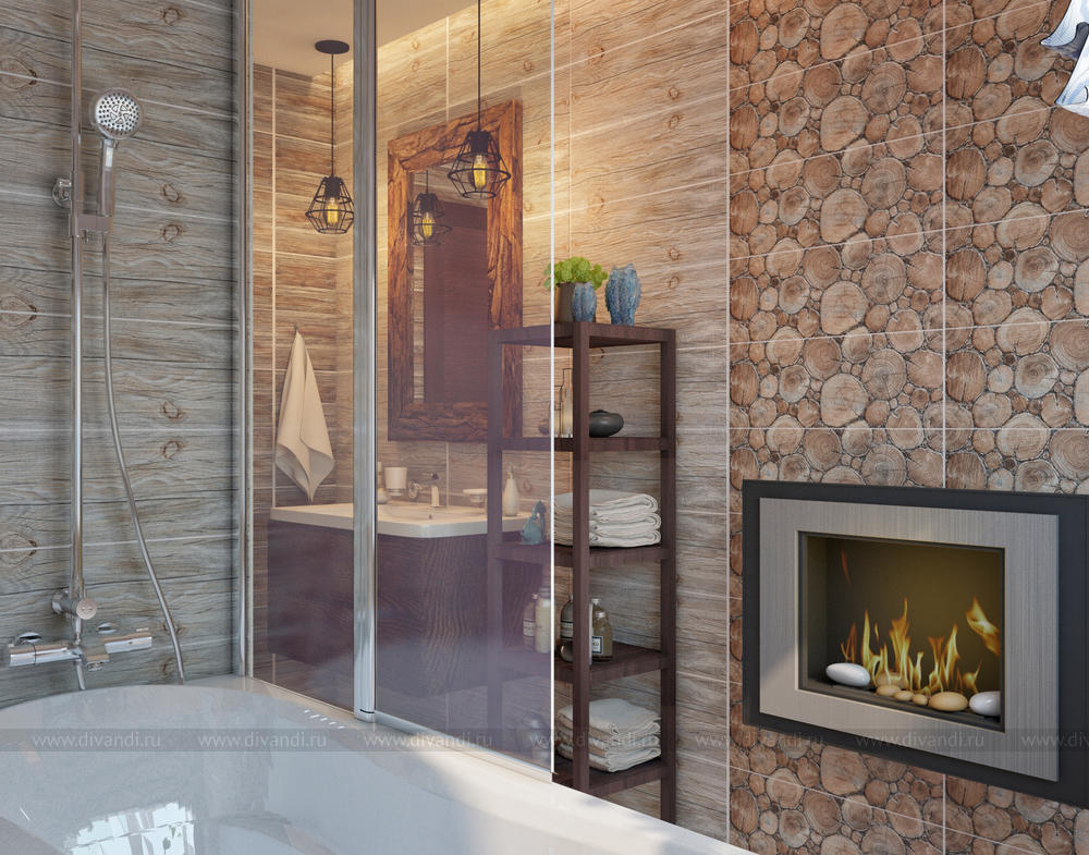 Дизайн ванной выполнен в смешанном стиле, тут и эко и, кантри, и лофт. Изюминкой является биокамин напротив ванной.