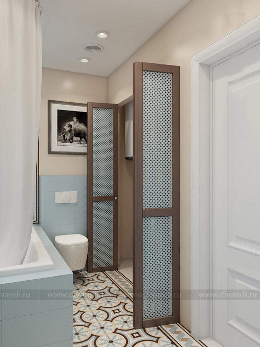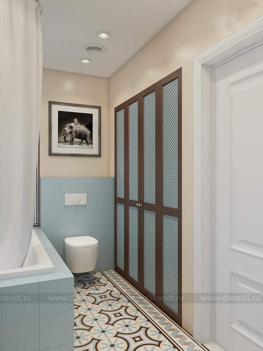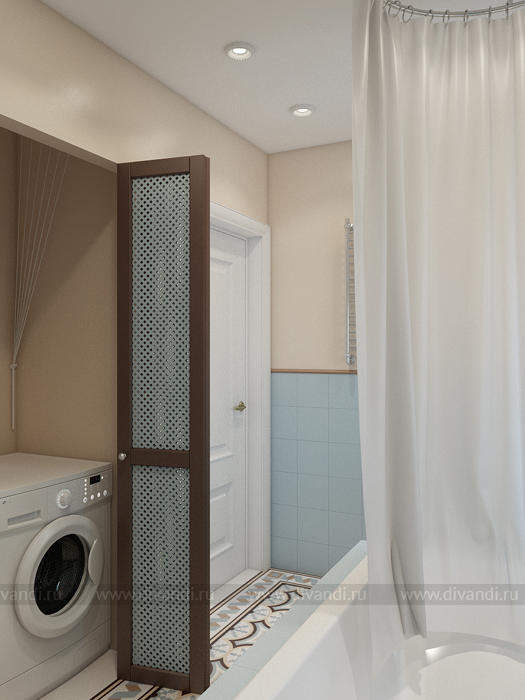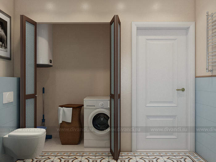 Ванная комната с окном не правильной формы! Казалось бы все супер, но нет. При проектировании сложности были с коммуникациями, надо было спрятать суку для бель и стиральную машину (все это в шкафу, сушилка на верху под потолком)