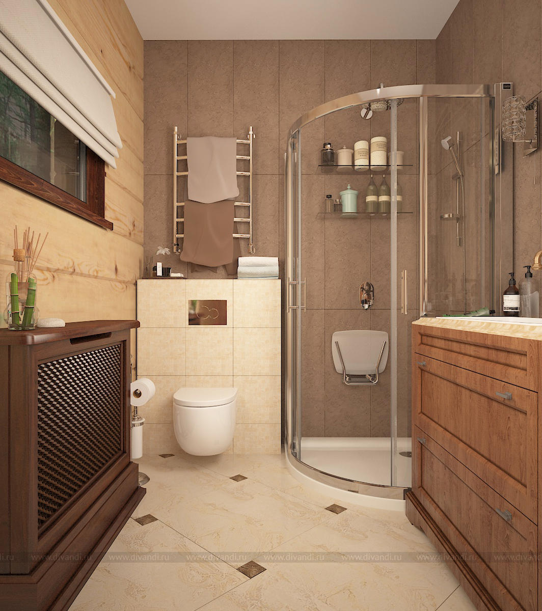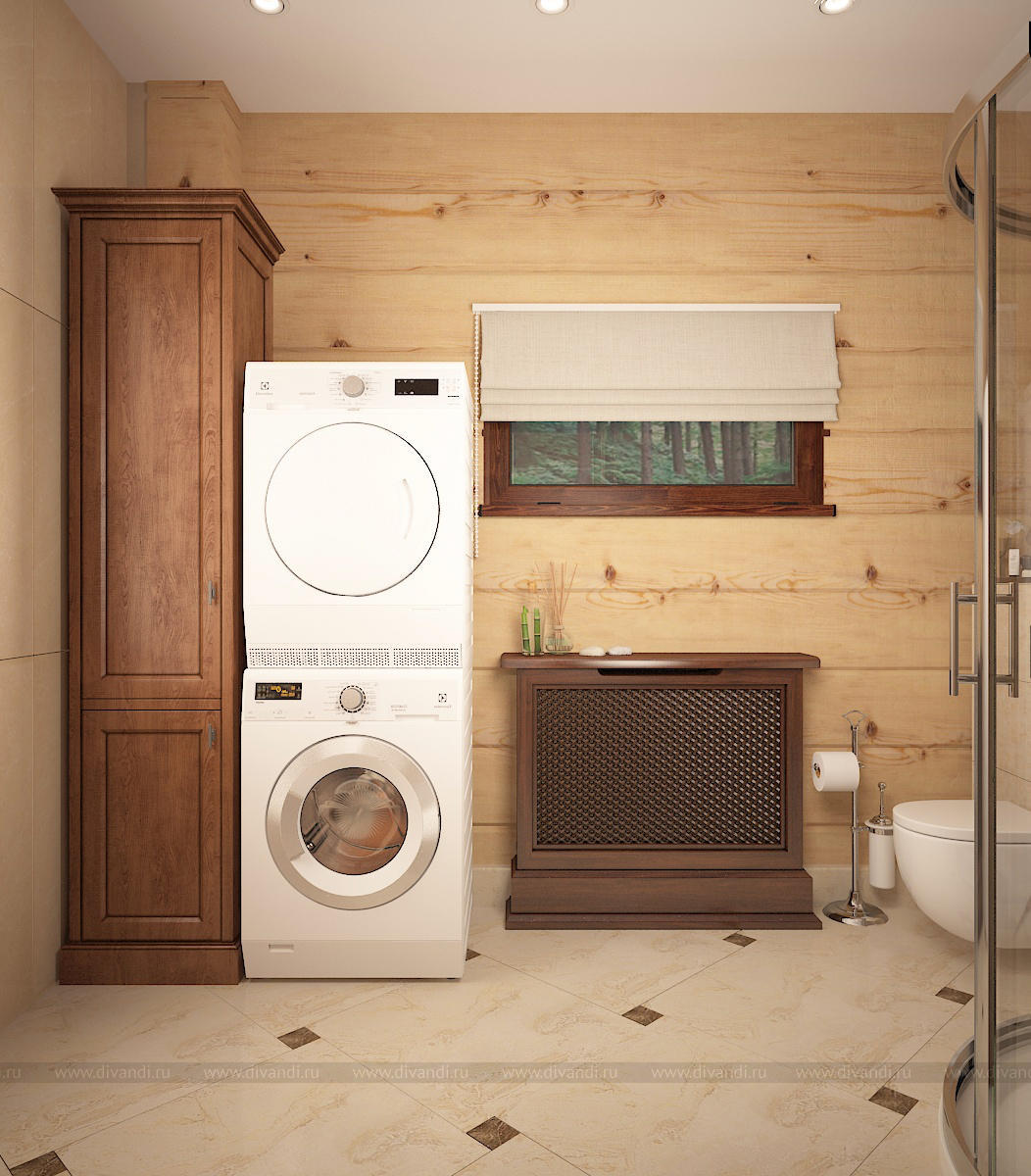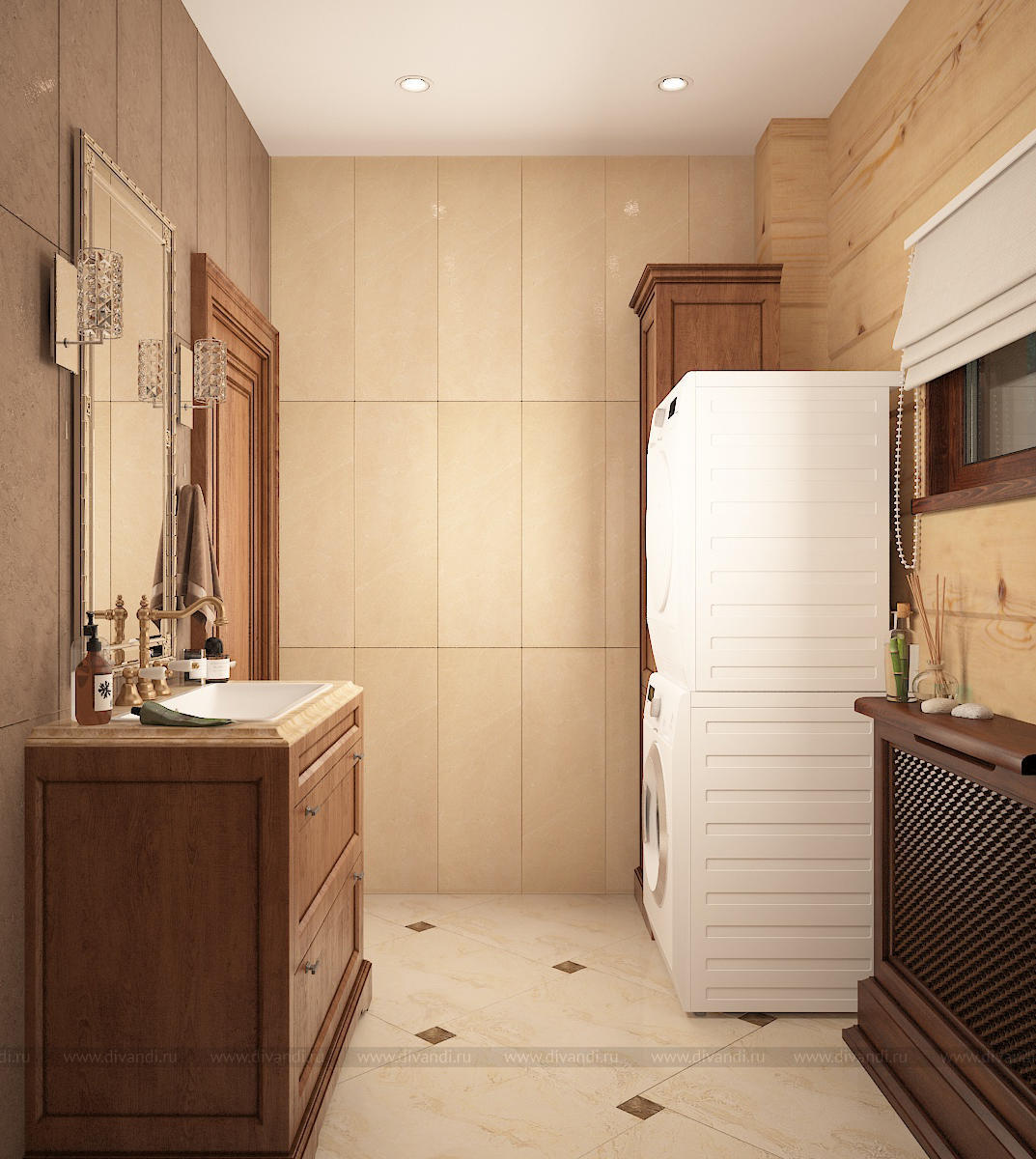 Ванной комната в коттедже из клееного бруса для заказчиков из Ханты-Мансийска. Мы решили оставить одну стену в брусе для натуральности. Только ее обязательно нужно обработать влагозащитными и антисептическими пропитками.