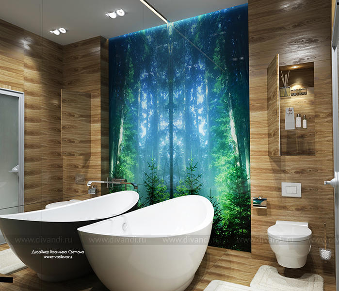 Небольшая ванная комната с отдельностоящей ванной и фотопечатью по стеклу с изображением соснового леса.