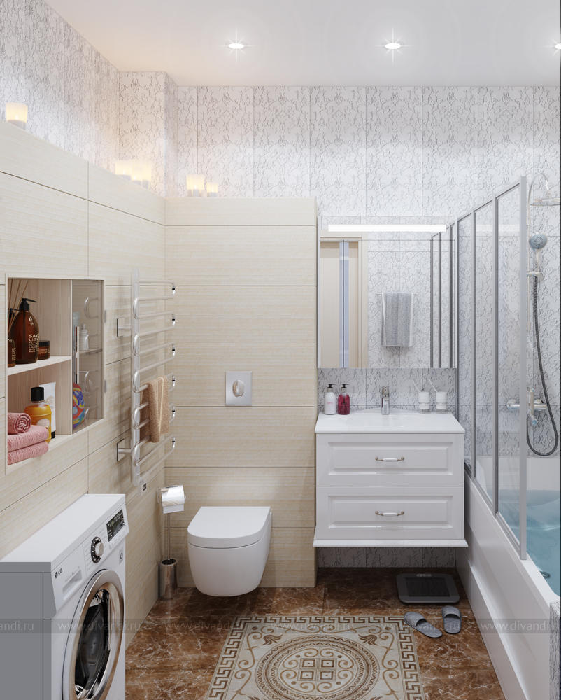 Ванная комната спроектирована в легком классическом стиле в теплых светлых тонах. Благородная рельефная плитка придает интерьеру ажурности и величественности.