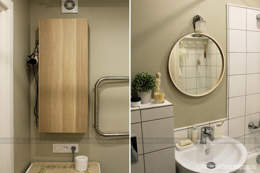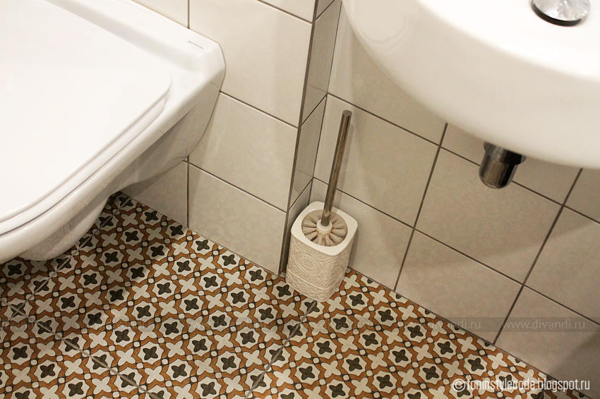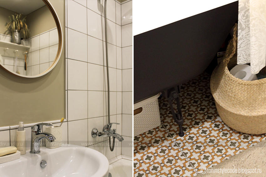Реализованный объект. Ванная комната площадью 3 м.кв. Классика стиля mid century - комбинация плитки и крашеных стен, пестрый орнамент на полу и светлые стены, чугунная ванная и деревянные акценты, простая геометрия в декоре - круги и квадраты. Экономичные решения без ущерба функции и эстетике.