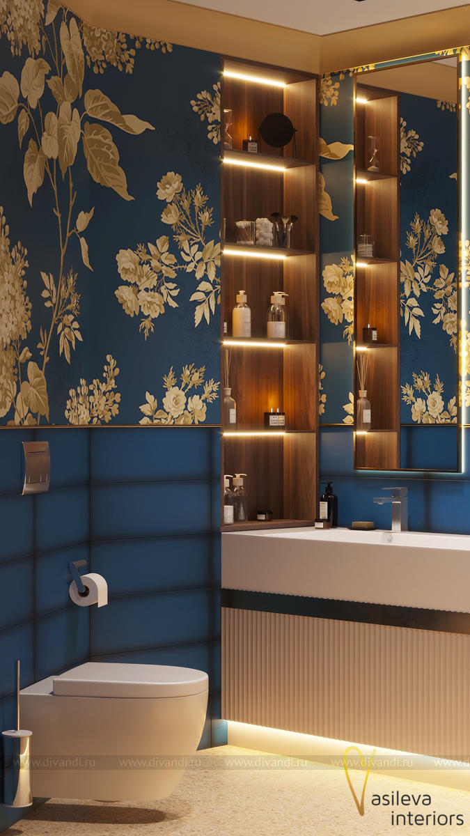 Мы искали что-то аутентичное, настоящее, искреннее. Так мы нашли луговые цветы и посеяли их на стены, рассыпали по потолку светильники - звёздочки и обрамили большую ванну-озеро плиткой сложного синего цвета, а на полу появилась песчаная фактура керамогранита.