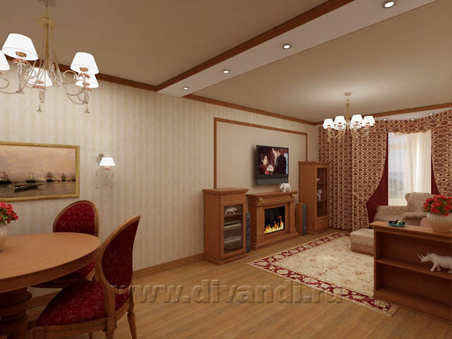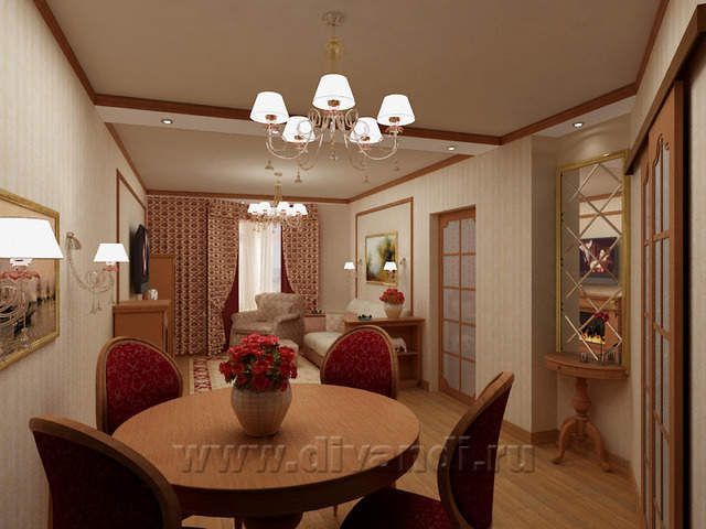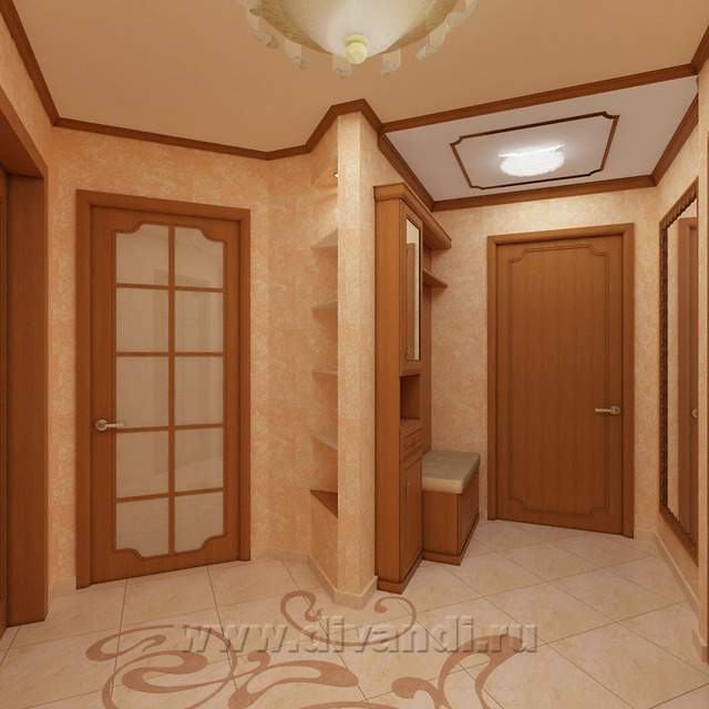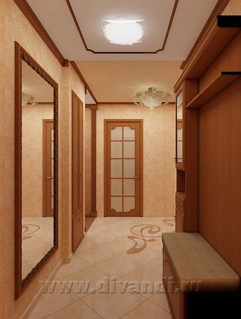 Не смотря на сложную, вытянутую планировку квартиры, благодаря серьезной проработке планировочного и последующего декоративного решения интерьеров, недостатки изначального пространства переросли в достоинство . Небольшой метраж прихожей зрительно увеличен за счет расположения зеркала, светлых тонов стен. Холл украшен авторским декоративным орнаментом на полу, и большой люстрой, придающей пространству парадности .