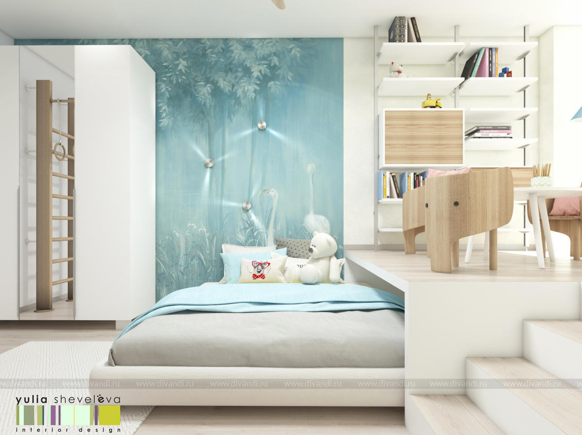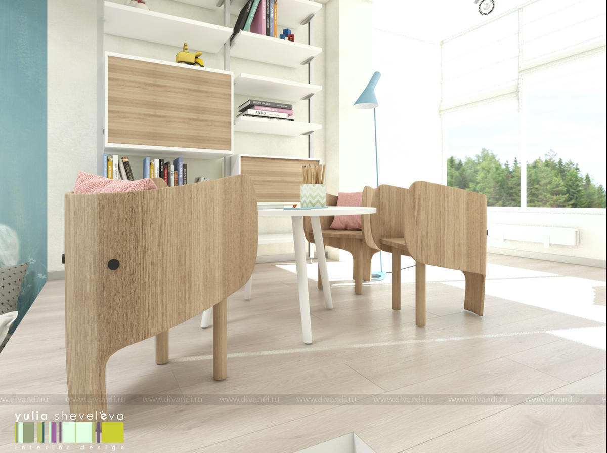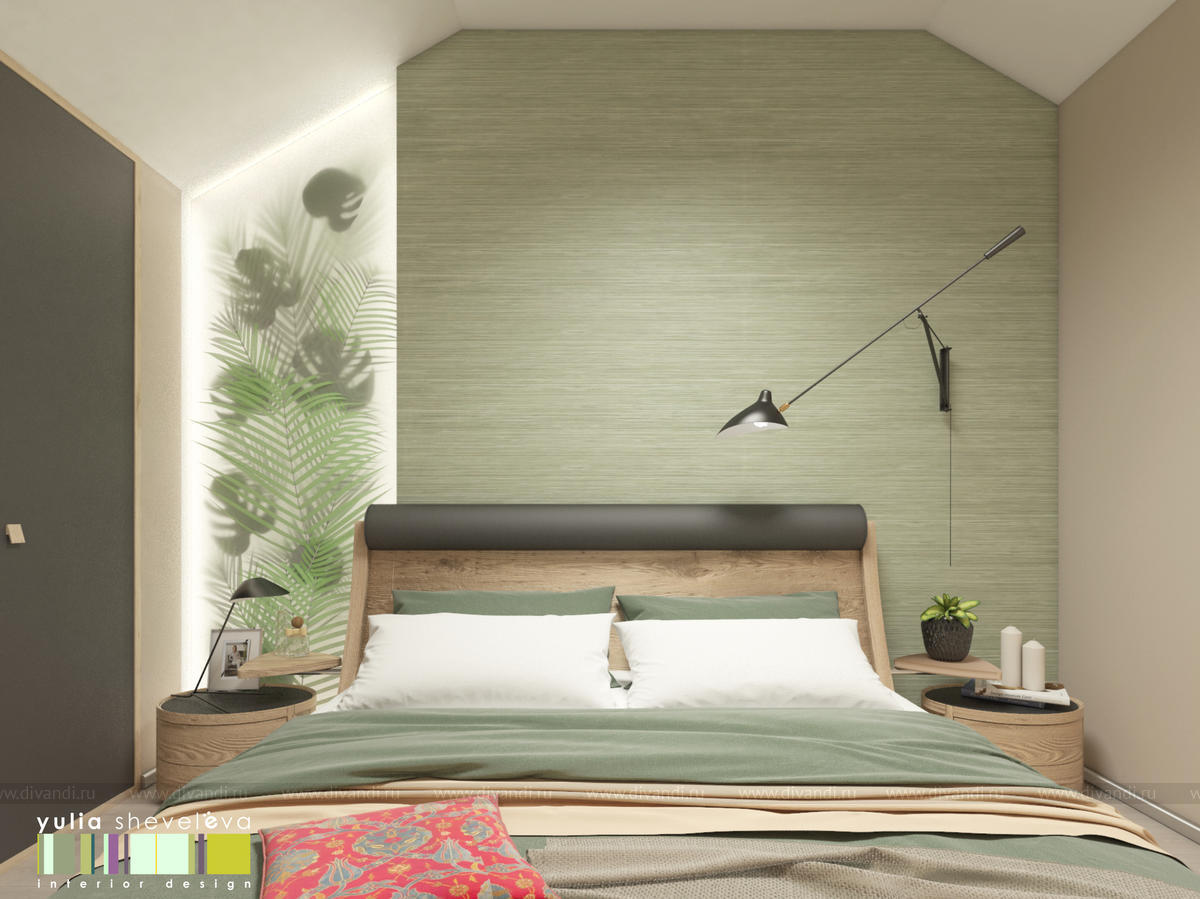 Тема природы органично вплетена в интерьер и прослеживается в каждом помещении. В детской ночной лес, в котором гуляют грациозные фламинго; в спальне на мансардном этаже появилось световое панно с листьями; в ванной комнате в качестве столешницы туалетного столика использован слэб экзотического дерева.