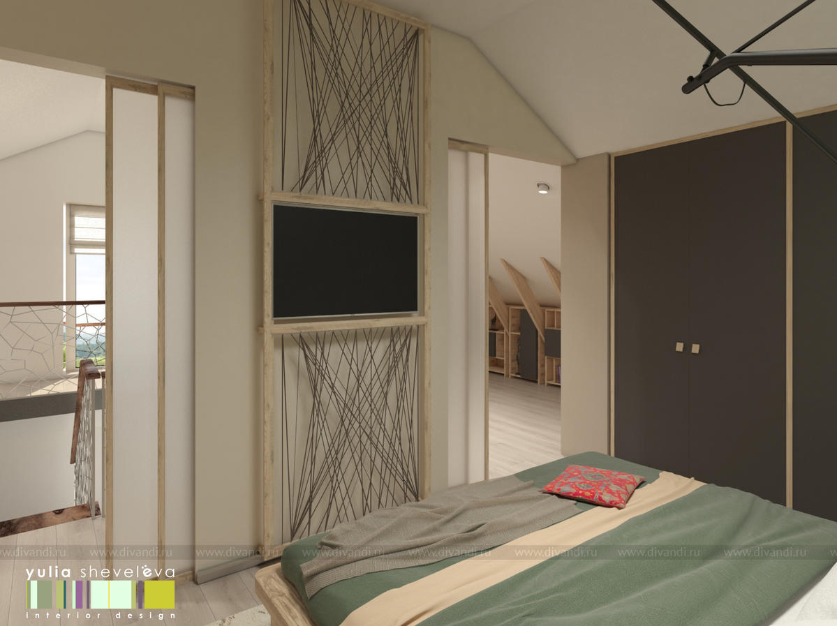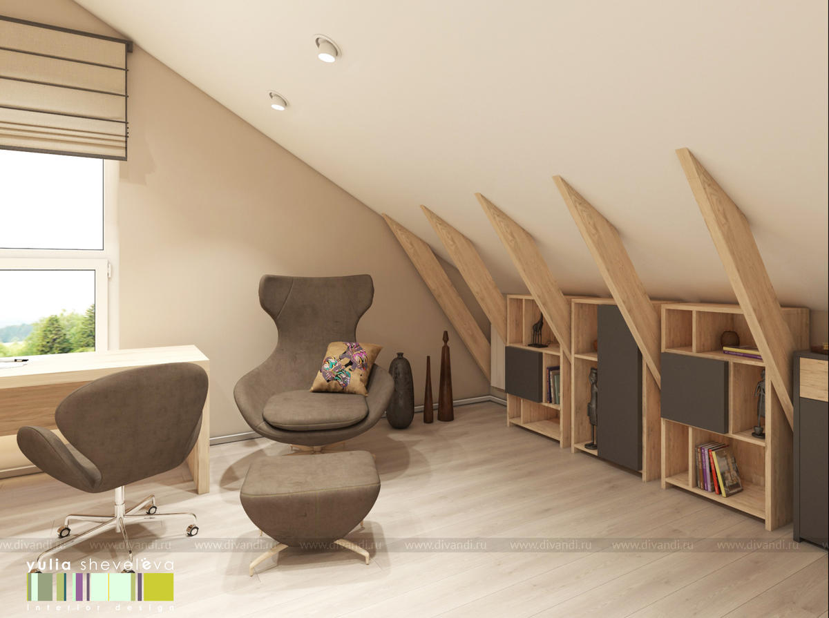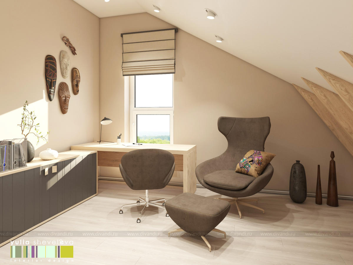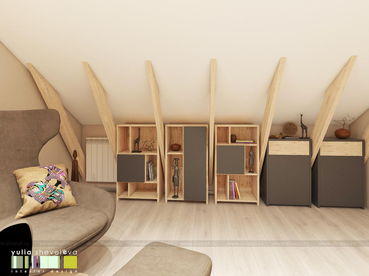 Тема этники любима и дорога хозяину дома. Поэтому по его просьбе, мансардный этаж оформлен в этом направлении. В последствии, на стенах и на полу появятся необычные вещи из личной коллекции хозяина, которые он привозит из разных уголков земного шара