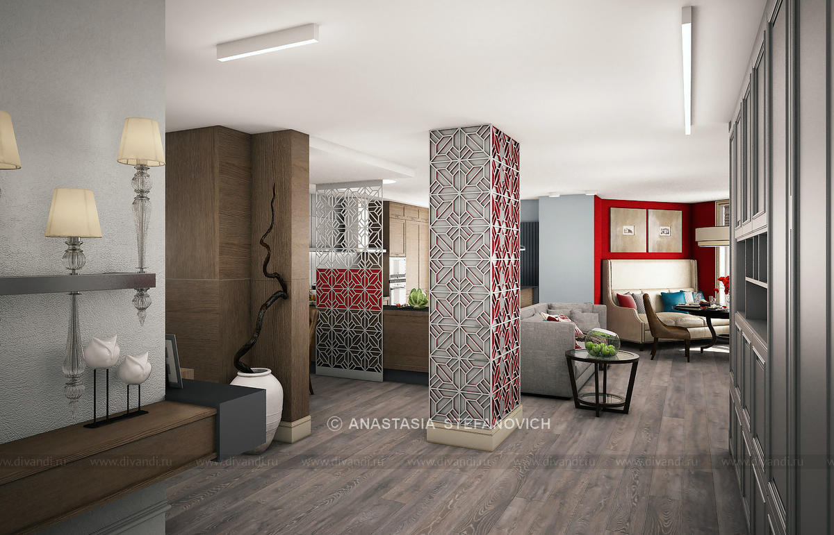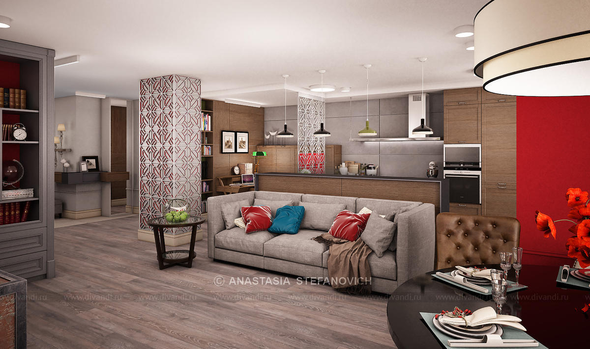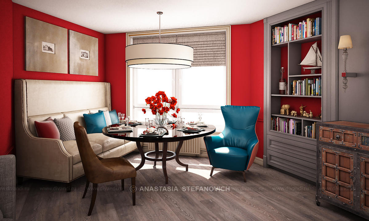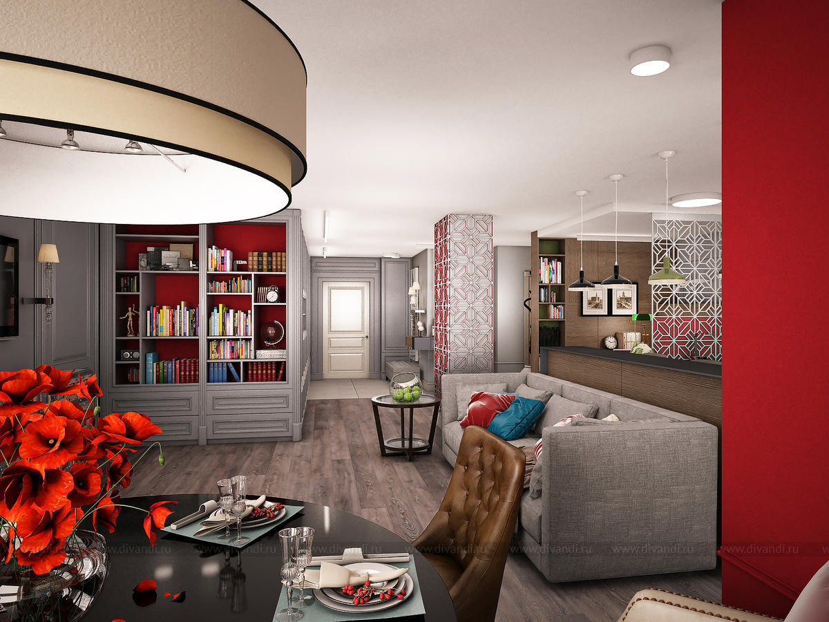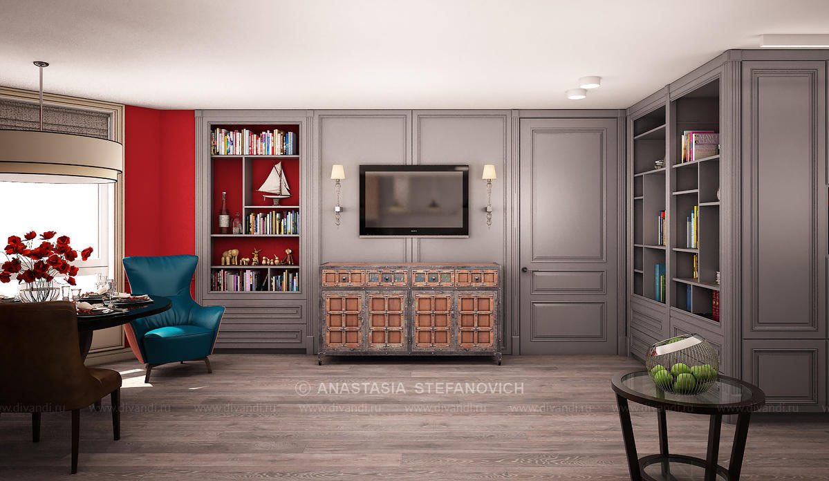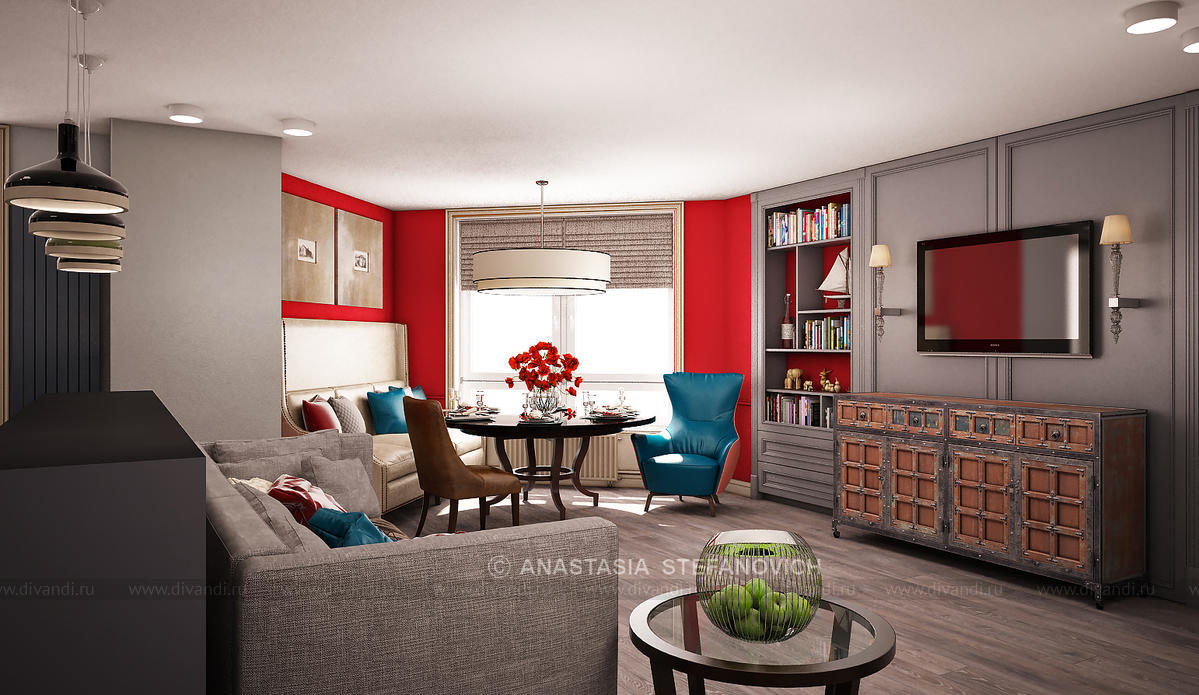 В этом интерьере главные цвета - классический красный и голубой стиль. Сочетание этих оттенков видит человек заходя домой и именно оно создает настроение.