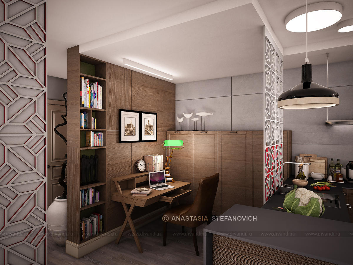 На нашей первой встрече заказчики этой квартиры показали интерьеры с очень смелыми сочетаниями цветов: фуксии с зеленым, бирюзы с горчицей, фиолетового с ежевичным... Мы решили что в каждой комнате будет свое сочетание, и каждое помещение будет неповторимым. В объединенном пространстве гостиной и кухни за ажурной перегородкой прячется мини-кабинет хозяина. Кухню и гостиную разделяет снек-бар.