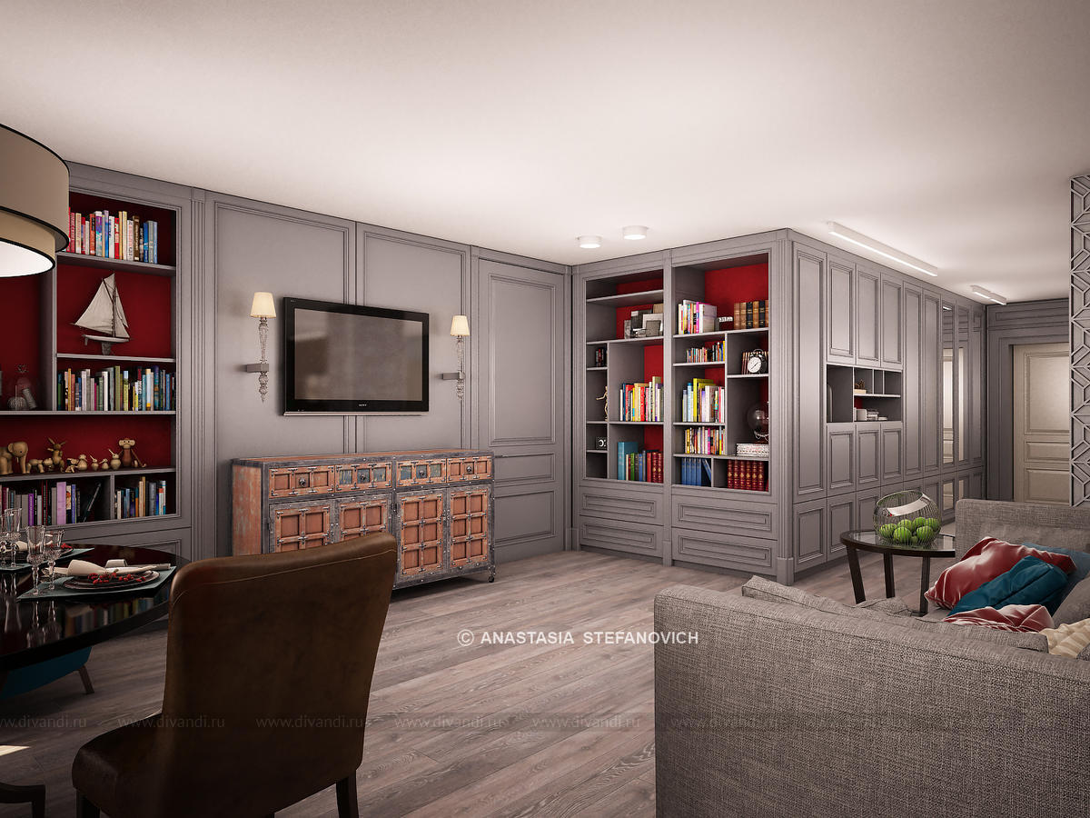 Основная идея - насыщенные, яркие и разные цвета для в каждом помещении и как основной и фоновый - серый цвет.