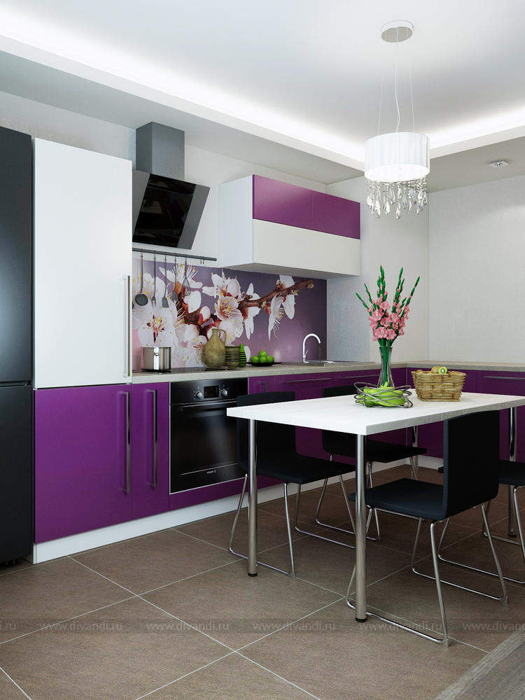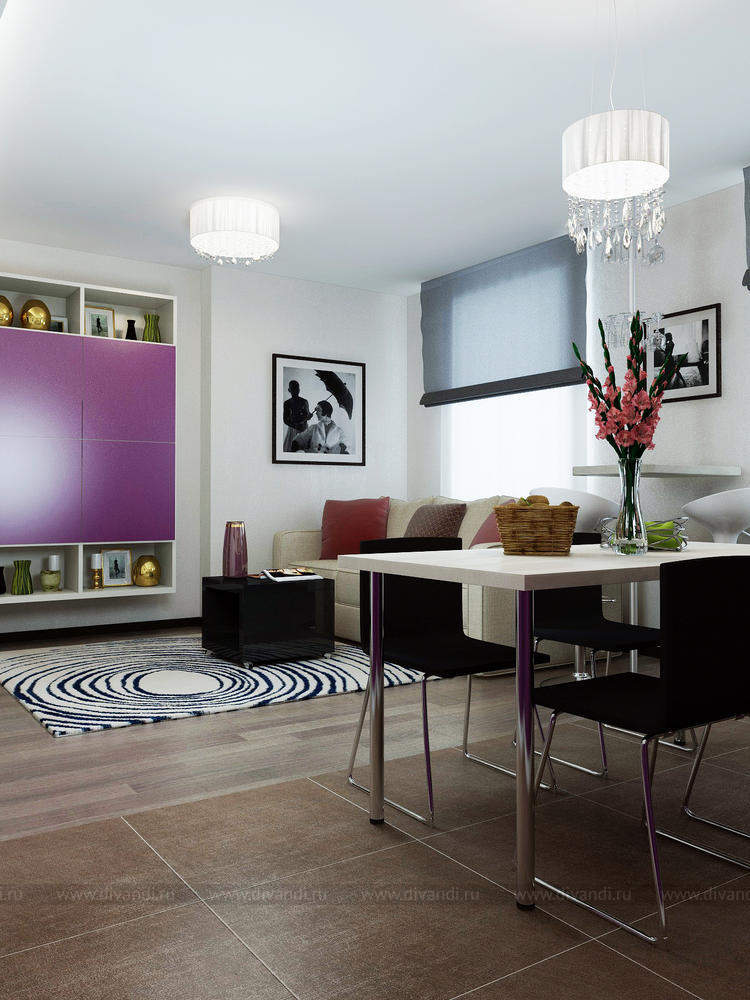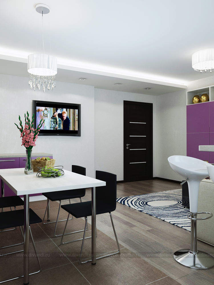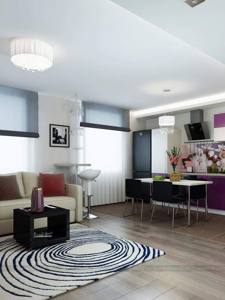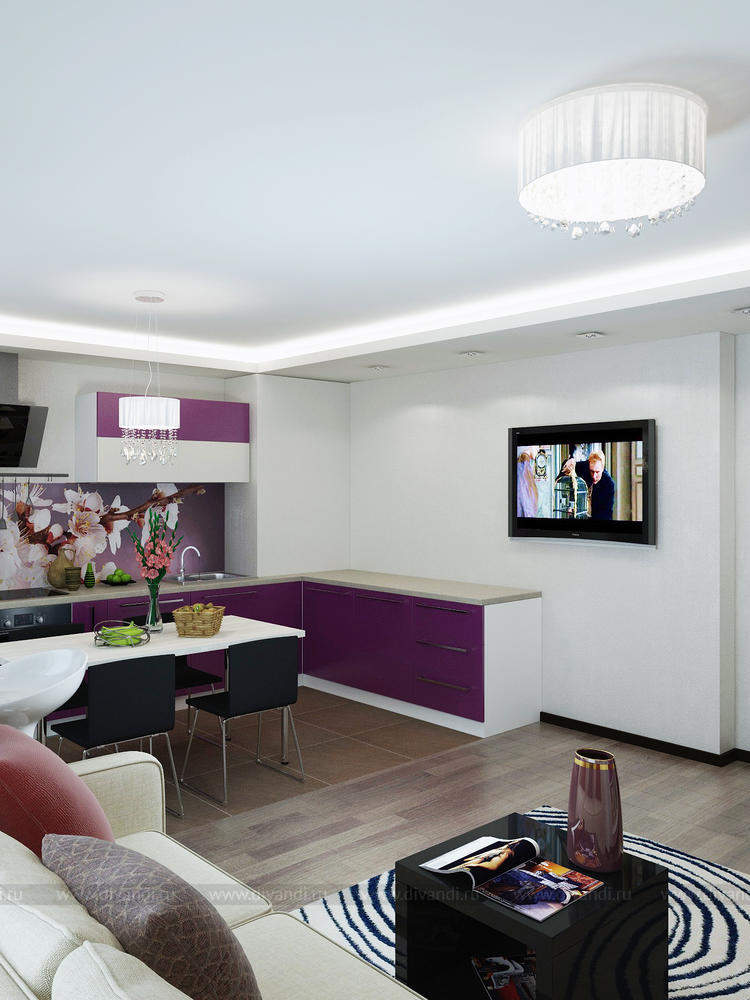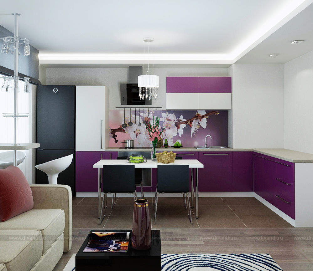 Кухня, совмещенная с гостиной в современном стиле. Яркая, контрастная, безусловно радующая хозяев своей оригинальностью.