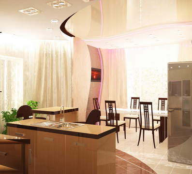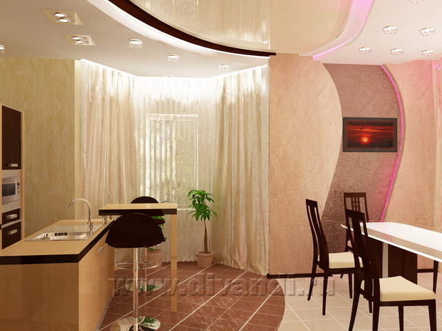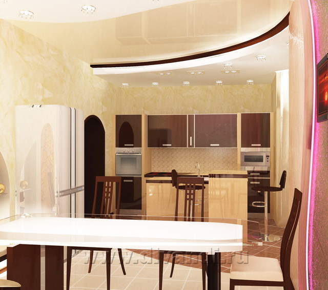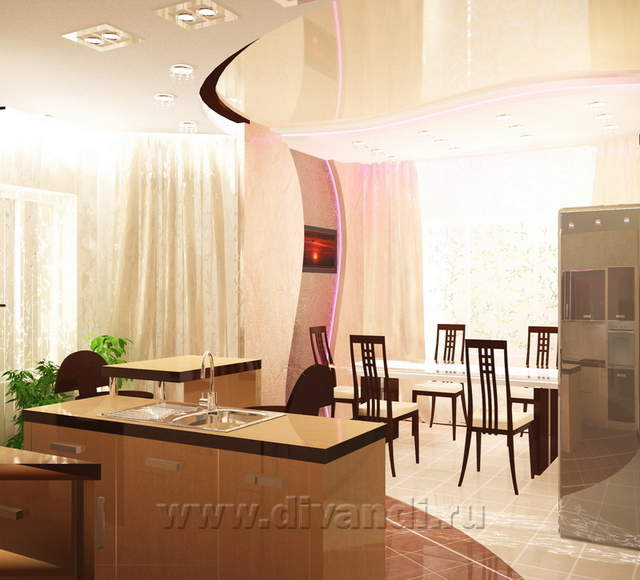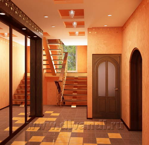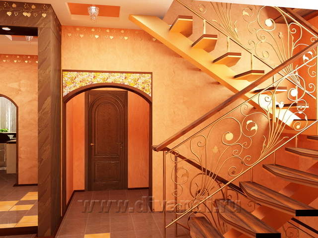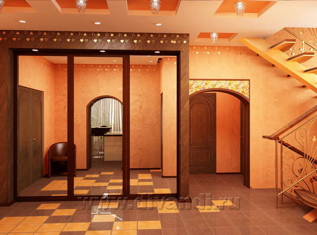 Как только вы переступаете порог дома, попадаете в яркий, праздничный холл, решенный во вкусной апельсиново-шоколадной цветовой гамме. Кухня выполнена в более пастельных тонах, но это у нее не убавляет индивидуальности. Плавность форм, подсветок, уравновешиваются лаконичностью мебельного гарнитура.