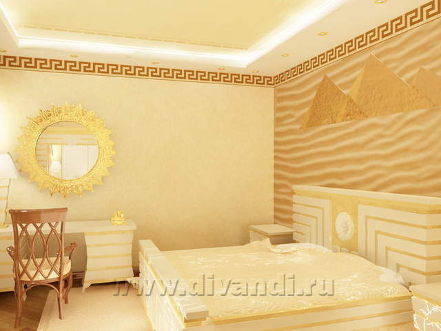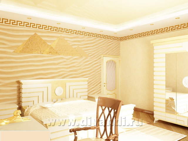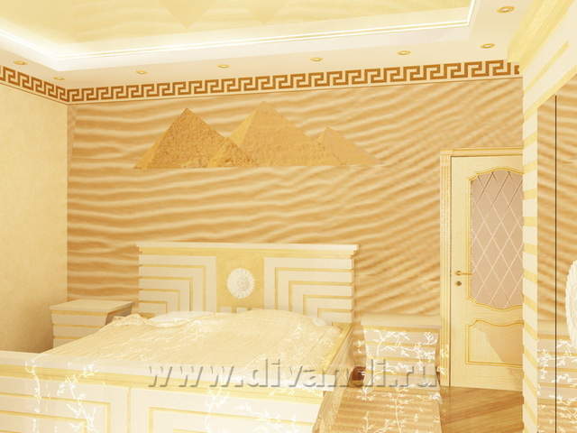 В спальне египетские мотивы напросились сами собой, т.к. заказчики влюбились в спальный гарнитур, который мы впоследствии обыграли декоративной росписью стен.