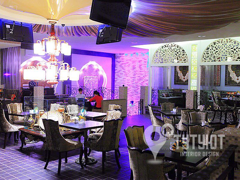 Проект ресторана Мама Азия построен на сочетании фактур, света и восточного декора. За счет этого создана интимная атмосфера таинственности. Заведение разделено на 2 уровня. Первый этаж для гостей с посадочными местами и второй этаж с радиальной планировкой. Последний формировался вокруг круглого танцпола. Его центр определила композиция из восточного декора, крупная люстра с перфорированными плафонами и конечно же потолок в форме купола, созданный из текстиля.