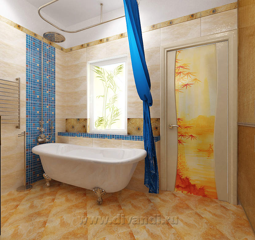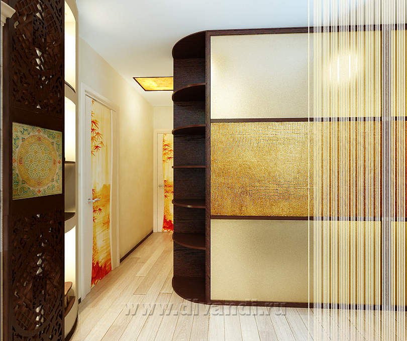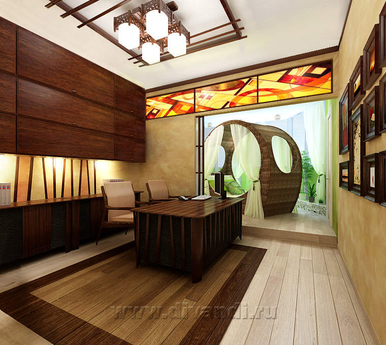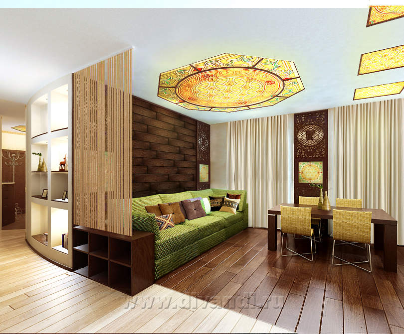 Данный проект выполнялся очень долго. Сначала шла работа над сложной планировкой, заказчик объединил 2 квартиры и получился очень длинный коридор с небольшими комнатами. В проекте мы старались использовать максимум функций из этого коридора. В процессе перепланировки образовалась большая постирочно-хозяйственная комната. Кухню-гостиную объединили и получили большую гостевую нарядную зону. С огромным мягким диваном, в котором расслабляешься после длинного трудового дня. Пожелания были сделать квартиру функциональной и с элементами восточного стиля. От традиционных светильников в зоне коридора, кухни-гостиной дизайнер решил отказаться, заменив их на витражные плафоны с элементами этнических рисунков и орнаментов. Спальни выполнены так же в этническом стиле. Были разные варианты решения ниши в бордовой спальне. Это роспись танцующих африканских человечков или зеркало. Детская комната мальчика - достаточно динамичная по цветам с росписью в виде дракона. Зона отдыха отделена от учебной зоны - колонными в виде деревьев и канатной сеткой. На стеке он размещает свои рисунки и фотографии. Также в детской комнате висит гамак, который полюбили все члены семьи. Ванная комната решена тоже в контрастных тонах. Красивая плитка с изображением хвоста павлина изыскано сочетается со смесью мозаики, которую мы подбирали на заказ. Кабинет выполнен в дереве, но это не традиционный кабинет английского стиля. Это больше этностиль в котором запланирована австралийская мебель Pacific green. При желании кабинет может быть объединен с зимним садом при помощи открывания большой откатной перегородки. Вверху стены над перегородкой запланированы витражи, которые будут пропускать естественный свет от зимнего сада в кабинет. В зимнем саду у нас до начала проекта была куплена кушетка для отдыха из ротанга. Поэтому она задала стилистику зимнего сада. Надо заметить, что все балконы в квартирах были сделаны теплыми и используются как часть помещения. Т.к. квартира расположена в пентхаузе, это очень оправдано. Сидеть любоваться видом нашего города почти в небе. В зимнем саду использовались естественные цвета зелени и светлое дерево на полу в сочетании с орехом. Сделали горку для цветов с подсветкой. В целом квартира получилась очень интересная, мы старались учесть пожелания заказчика и каждая зона получилась самобытной. Тем более заказчики часто путешествуют и привозят обилие декора из Азии и Африки.