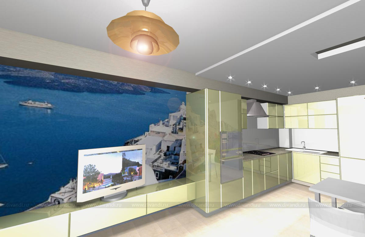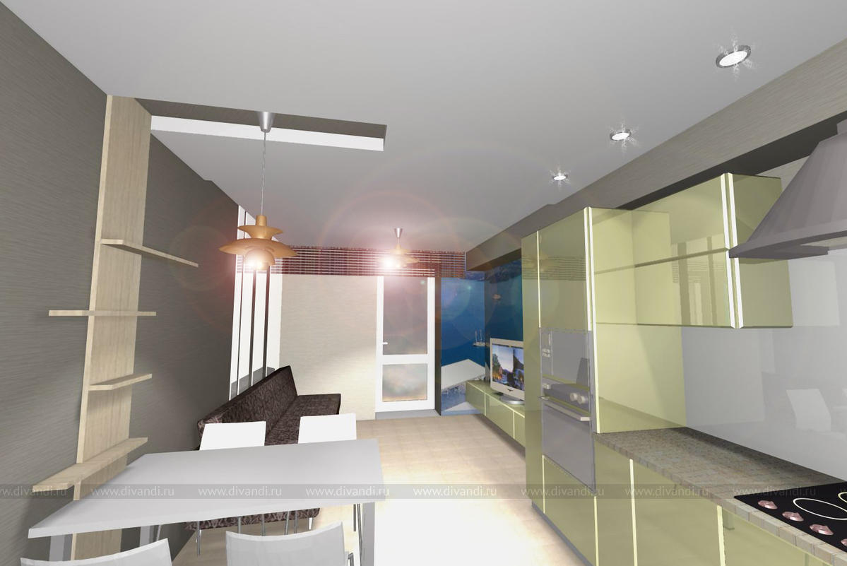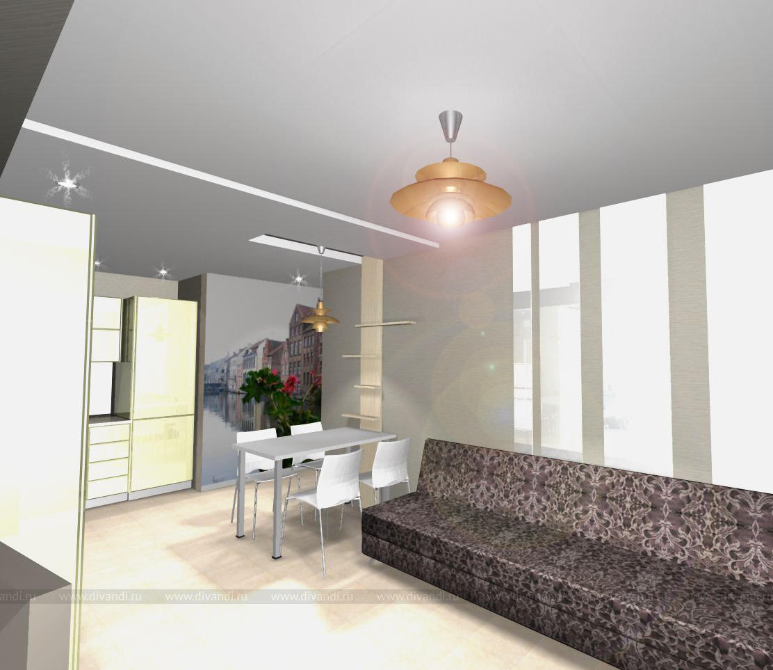 В перепланировке квартиры были учтены все пожелания заказчиков. Объединение кухни и гостиной, позволило выделить отдельное помещение для детской комнаты. Интерьер решен в светлых тонах, так как окна гостиной выходят на север. А полосы зеркал на стене около дивана, отражают солнечный свет, пропуская его дальше в глубину комнаты, в зону столовой и кухни!