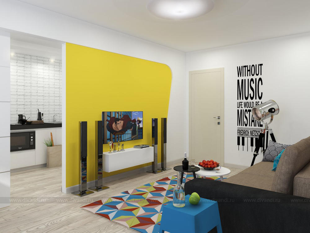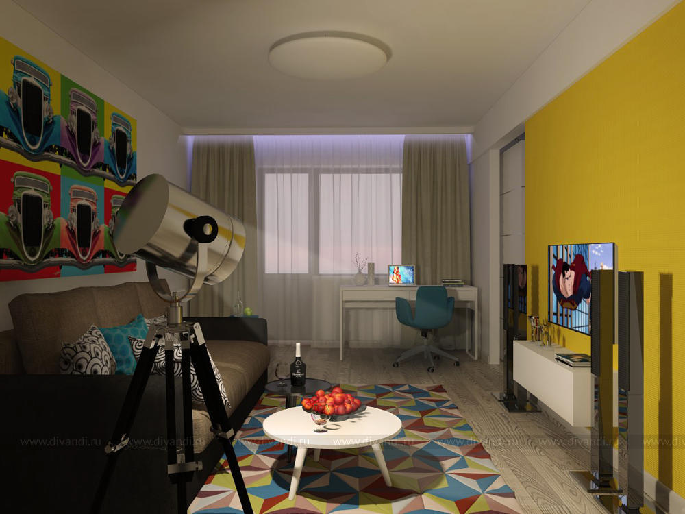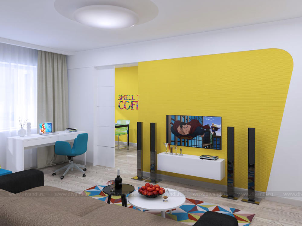 Целью данного проекта являлось увеличение пространства, использование смелого цветового решения, уйти от обыденности и создание функционального пространства для комфортного проживания разностороннего молодого человека, а также для приема гостей.