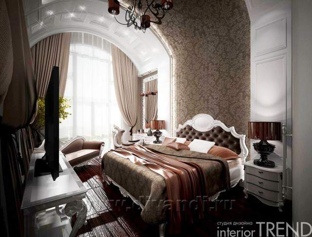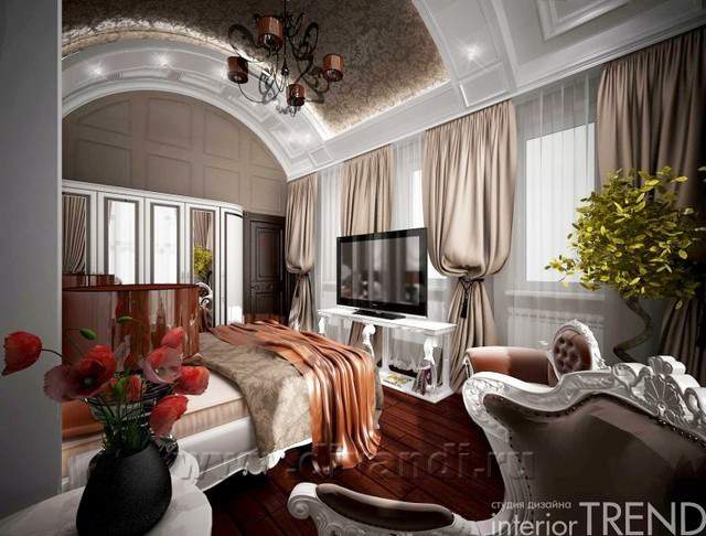 4.5 м. не о чем не говорящая единица измерения. Но для данного загородного дома это высота потолка, расположенная в спальне, приобрела особое значение. Совсем нестандартная высота приводит в некое замешательство в комнате стандартных размеров. Не всегда понятно как можно использовать такую красоту объема. Как все задействовать и при этом получить камерность интимного пространства. При всем при этом выдержать общую заданную стилистику дома и оставить приятное ощущение для заказчиков.