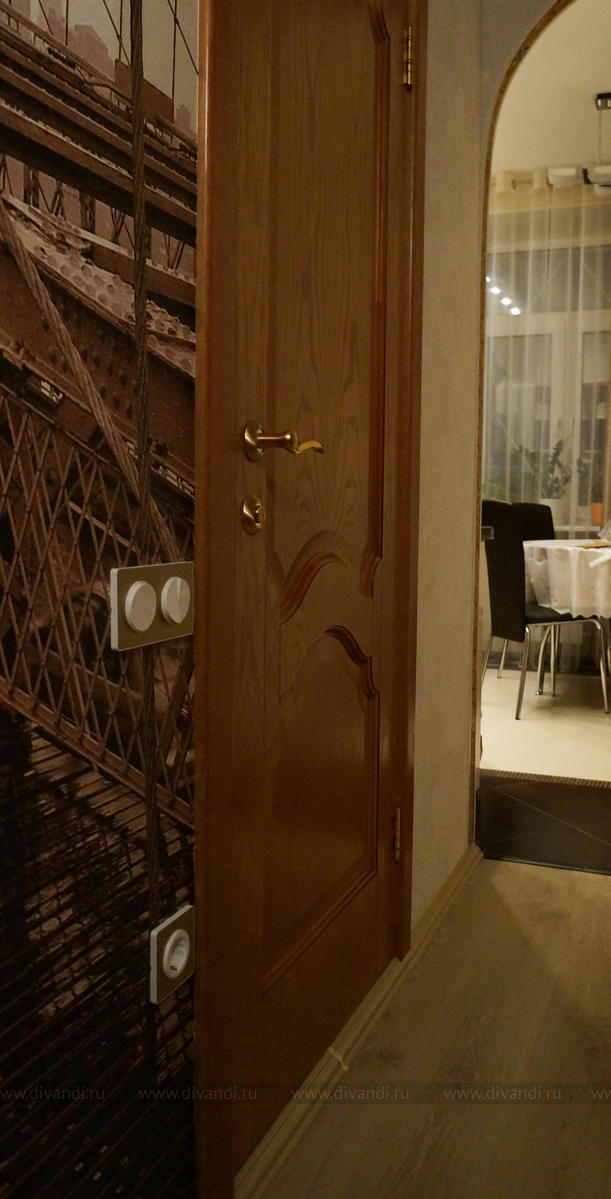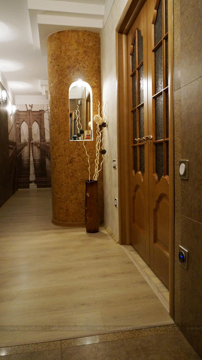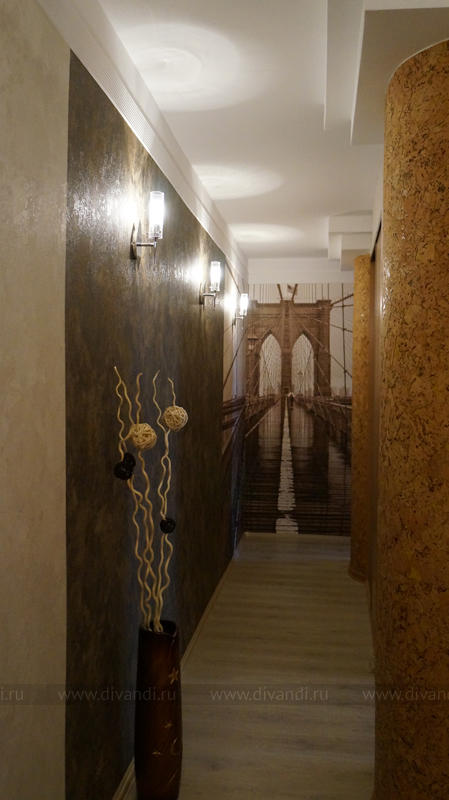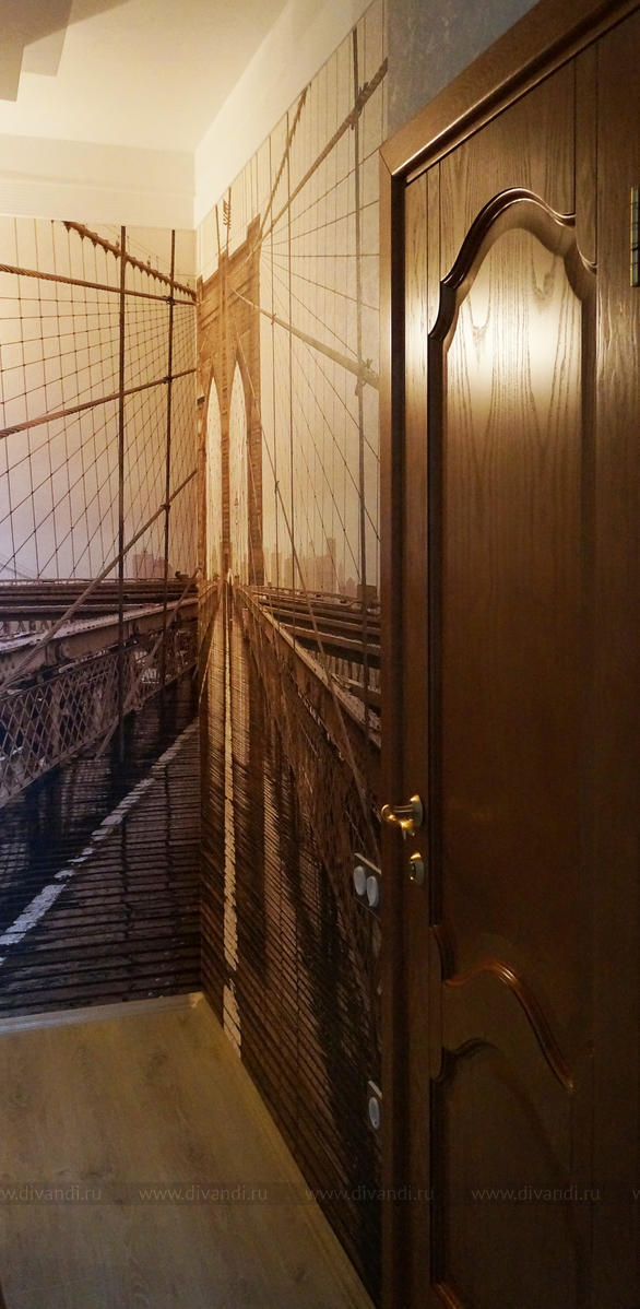 Разделив длинный и узкий коридор на темные и светлые части, добилась эффекта расширения пространства. Фреска с фотографией Бруклинского моста, размещенная в конце коридора, увлекает взгляд и напоминает о чудесных мгновениях путешествий!
