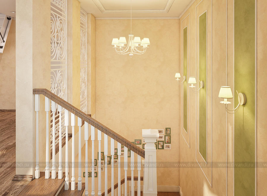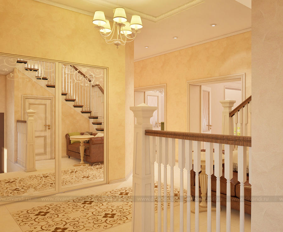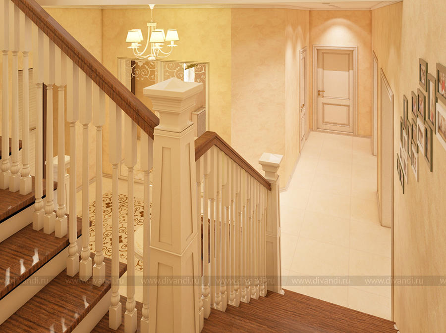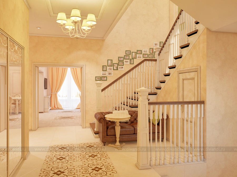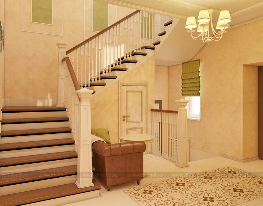 Дизайн-проект холла и лестницы выполнен в классическом стиле.