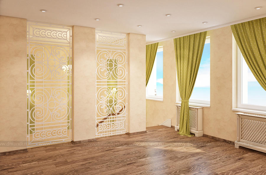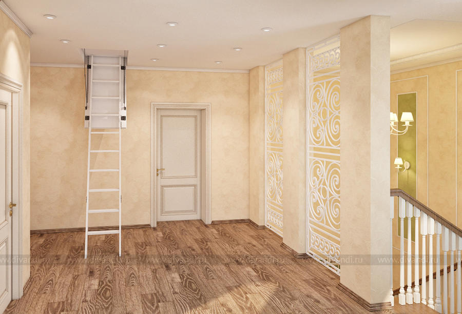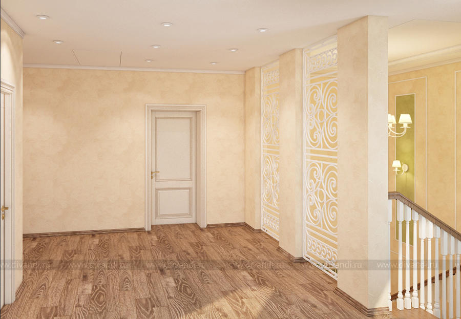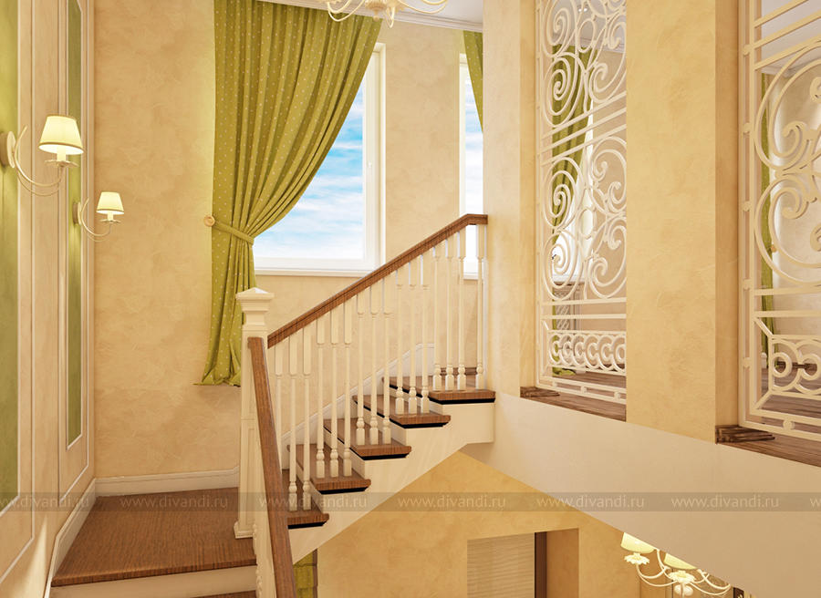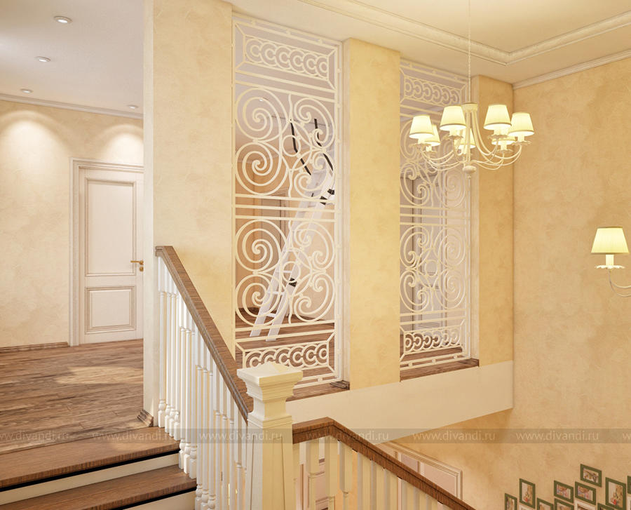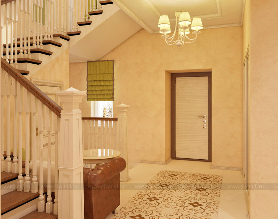 Дизайн-проект холла и лестницы выполнен в классическом стиле.