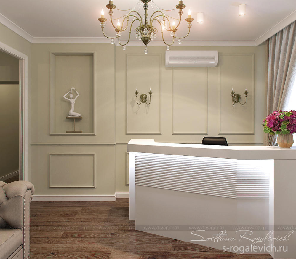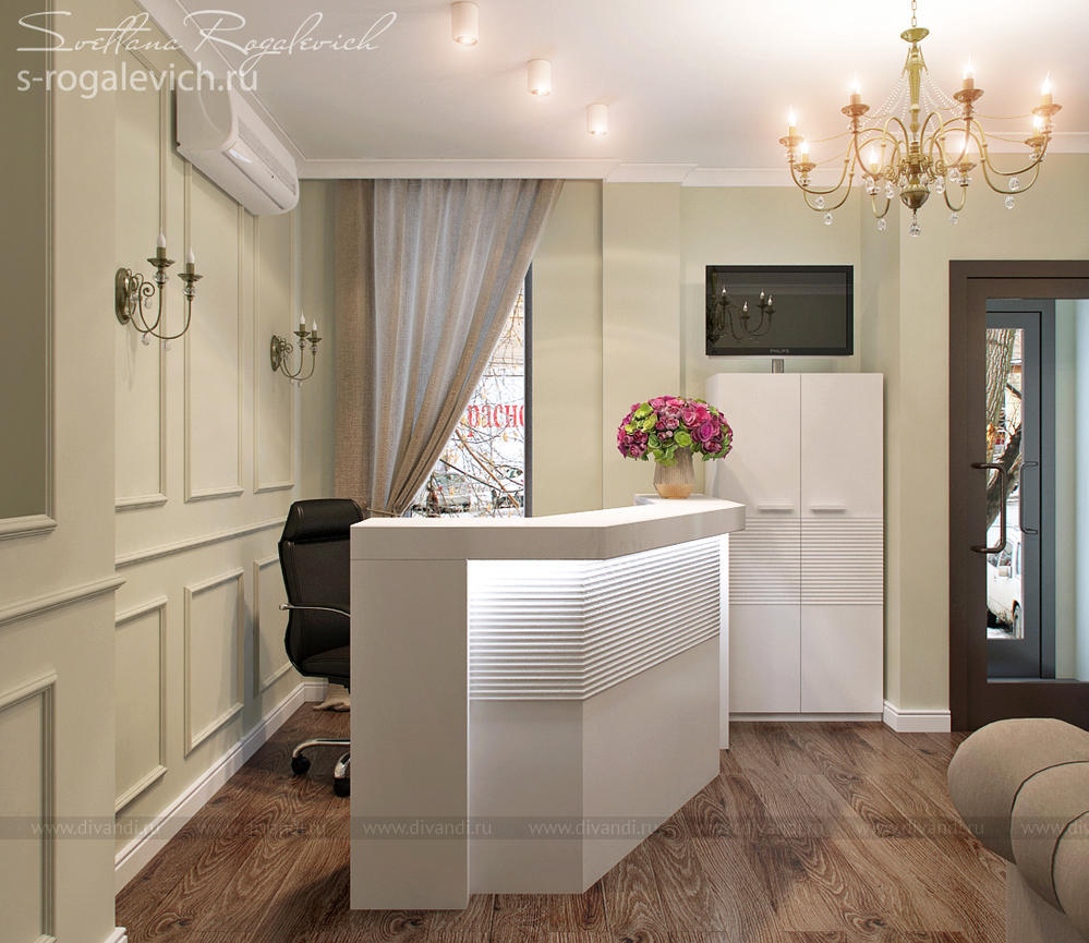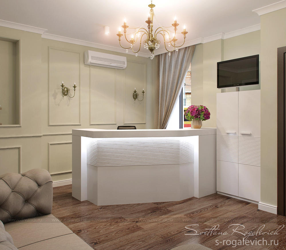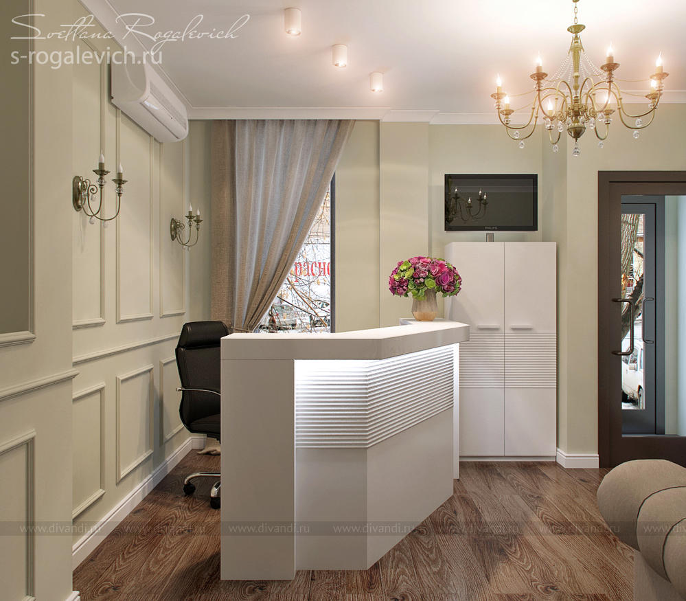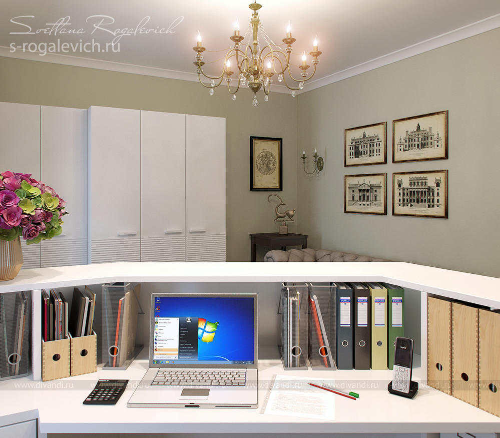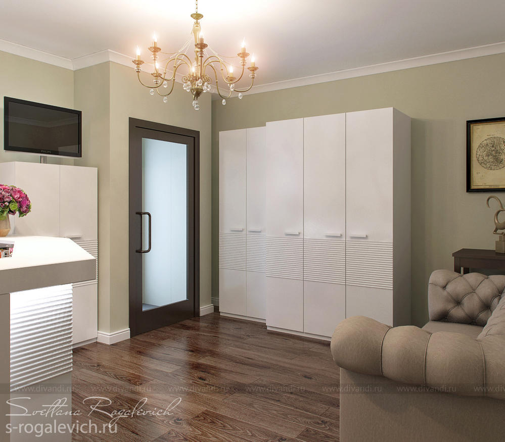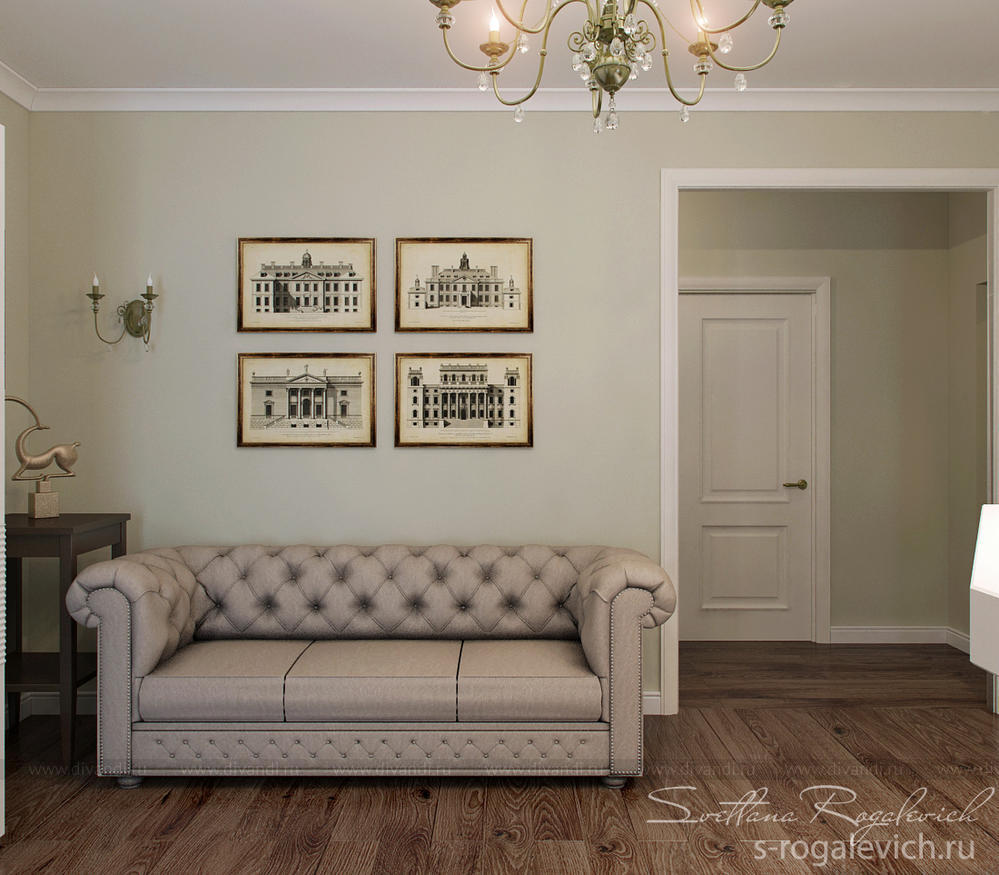 Интерьер помещения включает элементы нео-классики. Приятные глазу, спокойные оттенки, лаконичная белая корпусная мебель на контрасте с диваном Честер, легкий и элегантный декор стен - в целом получился интересный непринужденный микс.