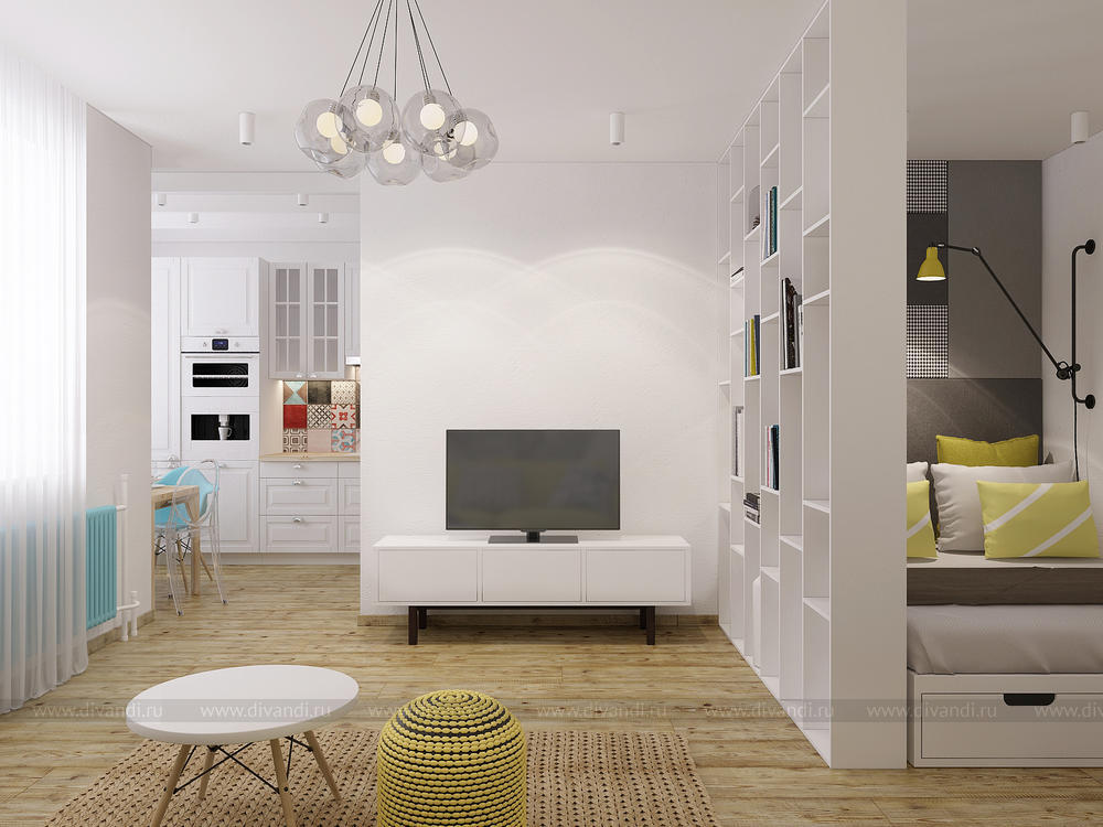 Интерьер однокомнатной квартиры (46 кв.м.) для девушки-студентки выполнен в скандинавском стиле. Для юной хозяйки очень была важна экологичность, которая играет в скандинавском стиле главенствующую роль. Квартира получилась лаконичной, изящной и легкой и "с настроением". Думаем, что такой интерьер вдохновит девушку на победы.