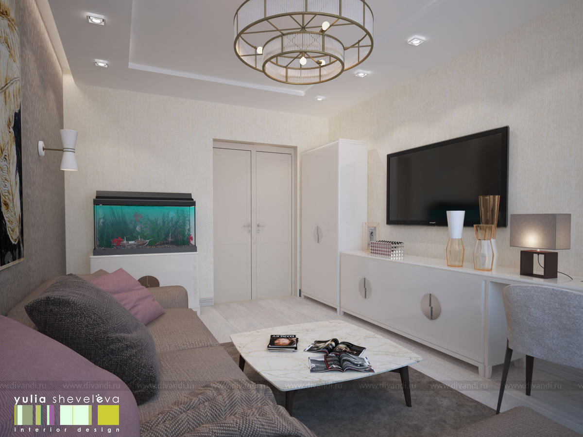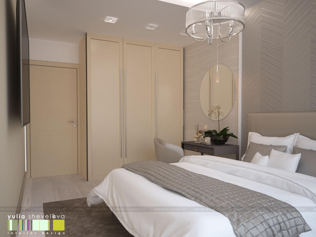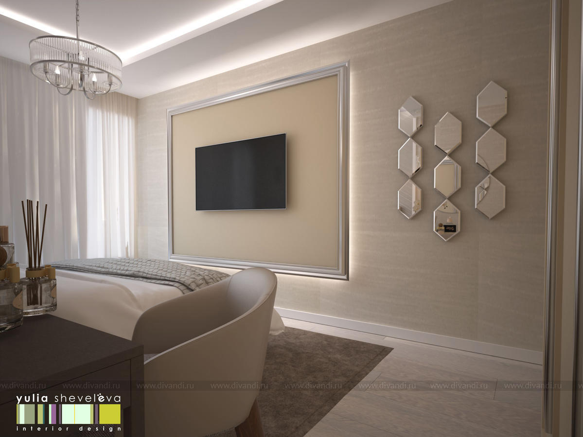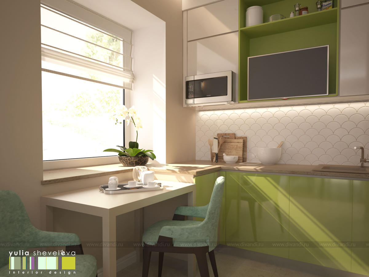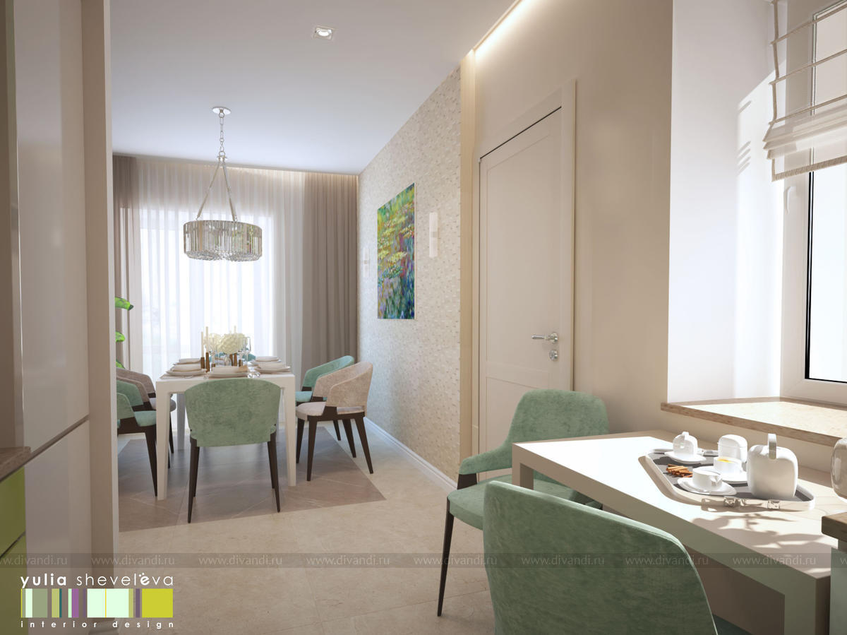 решений и легких элементов стиля mid century modern. Оформление дома отражает характер и динамичный образ жизни хозяев, поэтому принцип комбинации разных по стилю вещей и решений хорошо подходит к данному проекту. Здесь хрустальная люстра в сочетании с яркой глянцевой кухней цвета майской зелени; межкомнатные двери, декорированные филёнками, в гармонии со строгой и сдержанной по форме мебелью.