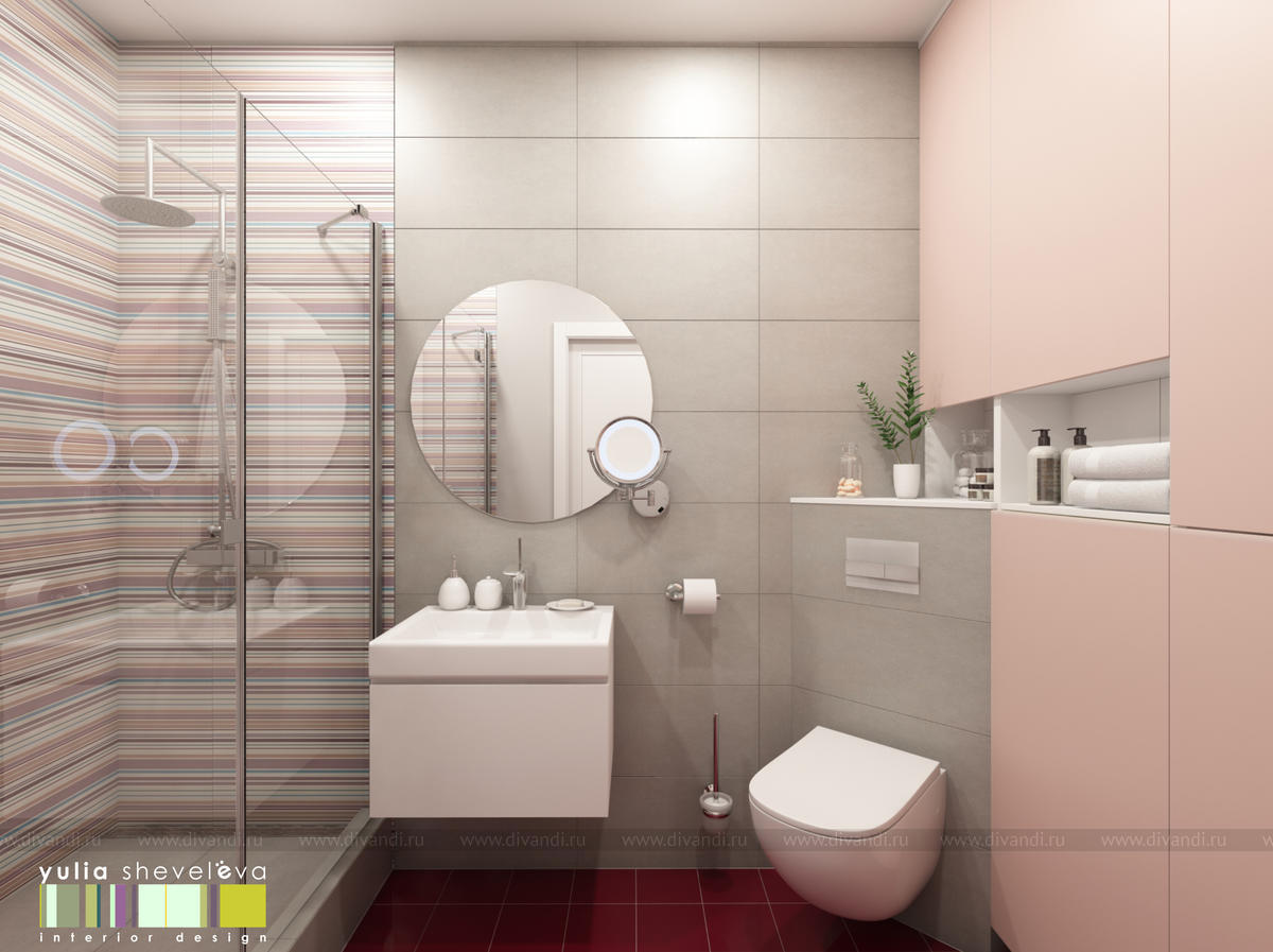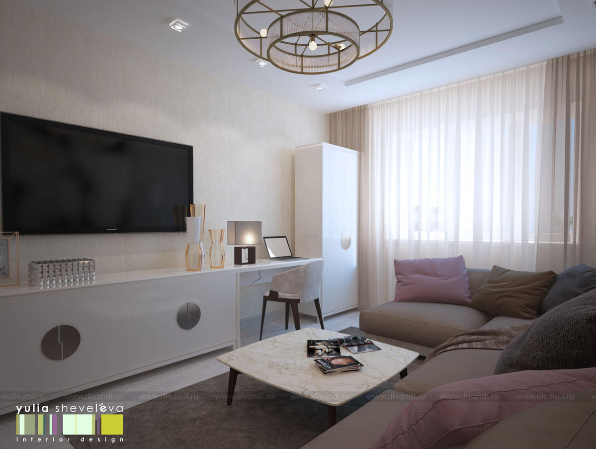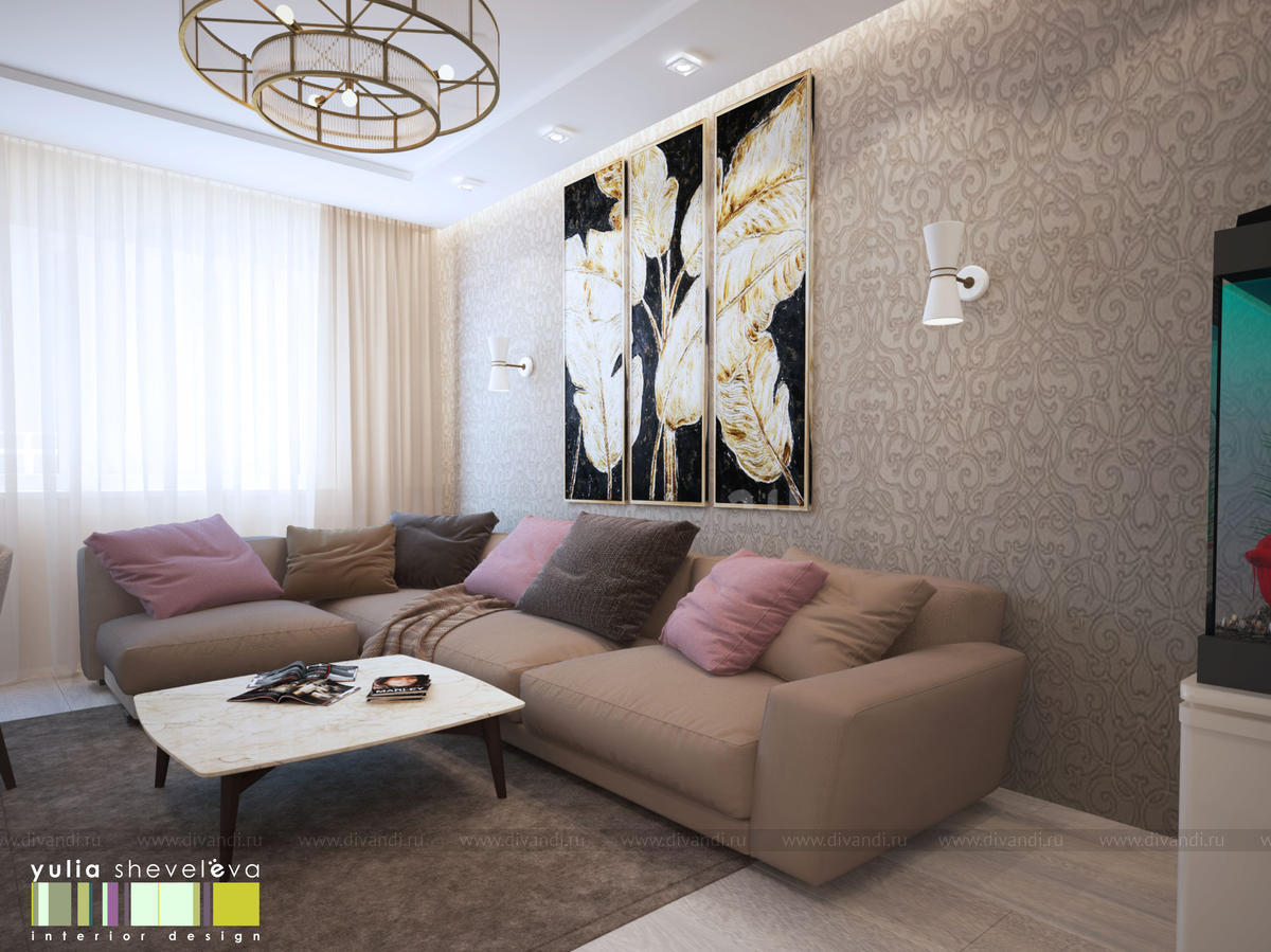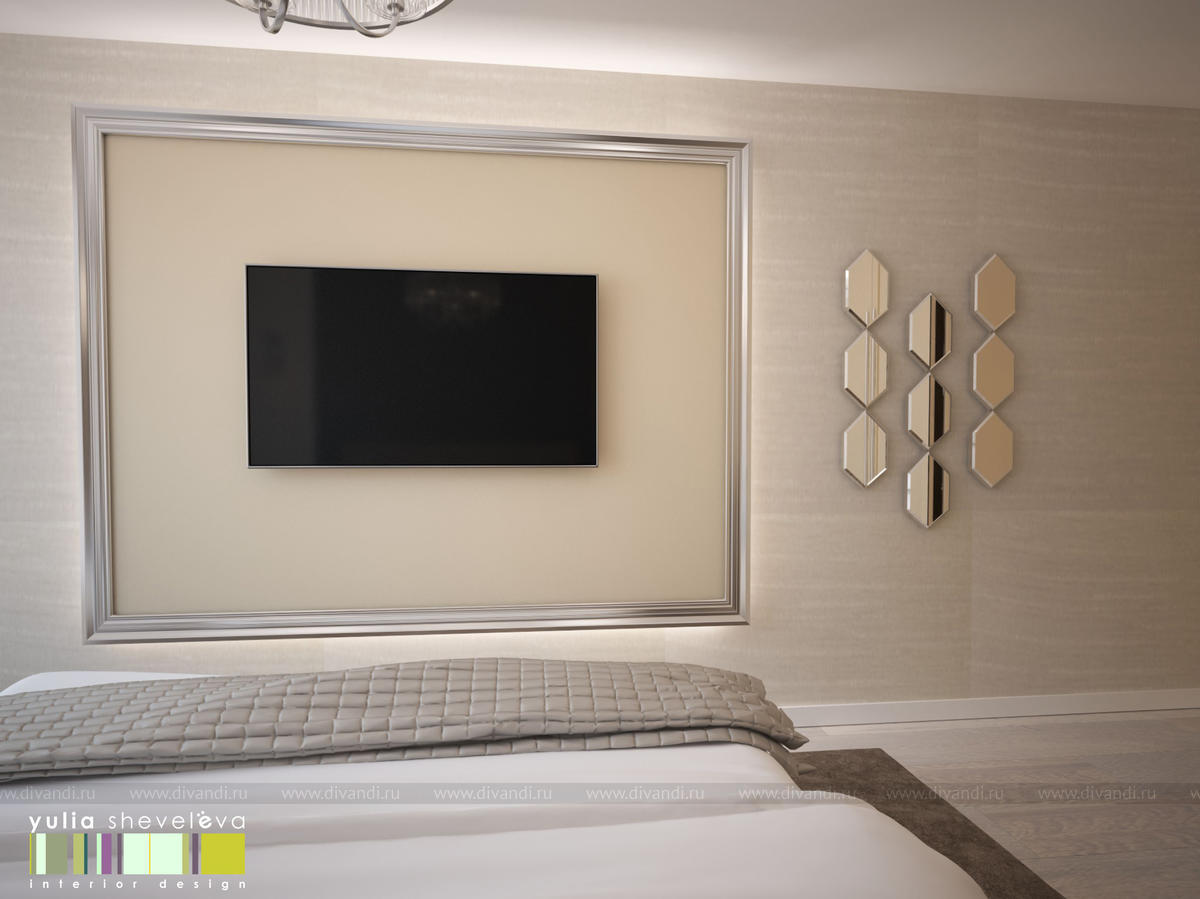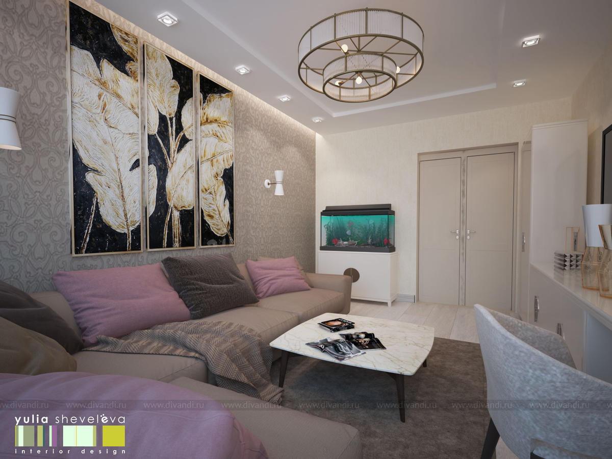 решений и легких элементов стиля mid century modern. Оформление дома отражает характер и динамичный образ жизни хозяев, поэтому принцип комбинации разных по стилю вещей и решений хорошо подходит к данному проекту. Здесь хрустальная люстра в сочетании с яркой глянцевой кухней цвета майской зелени; межкомнатные двери, декорированные филёнками, в гармонии со строгой и сдержанной по форме мебелью.
