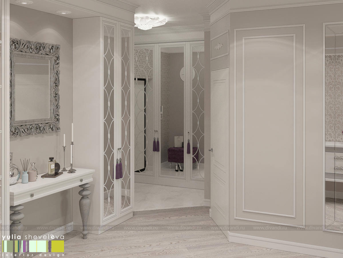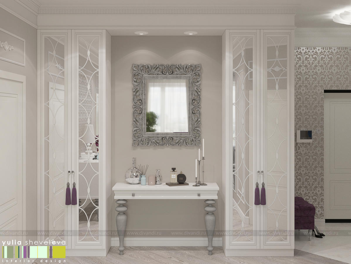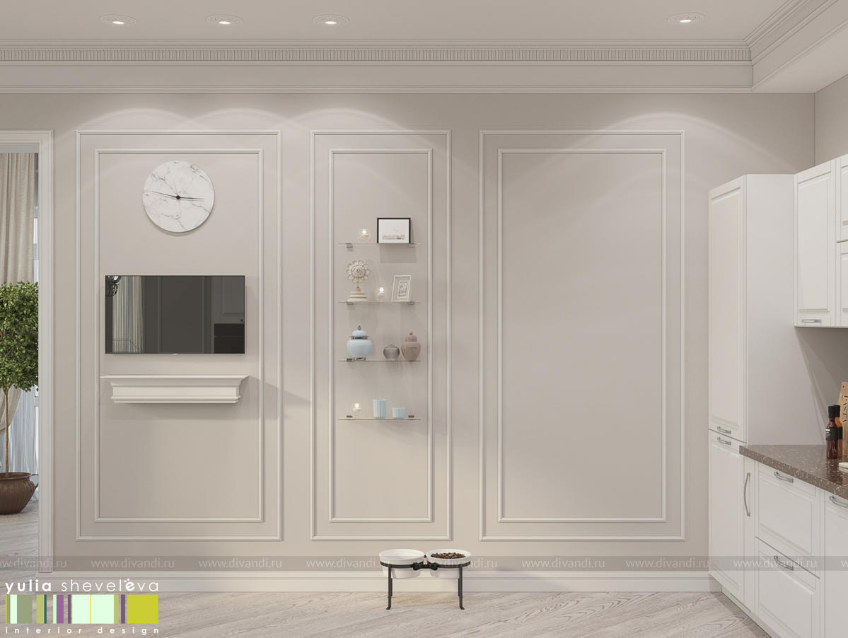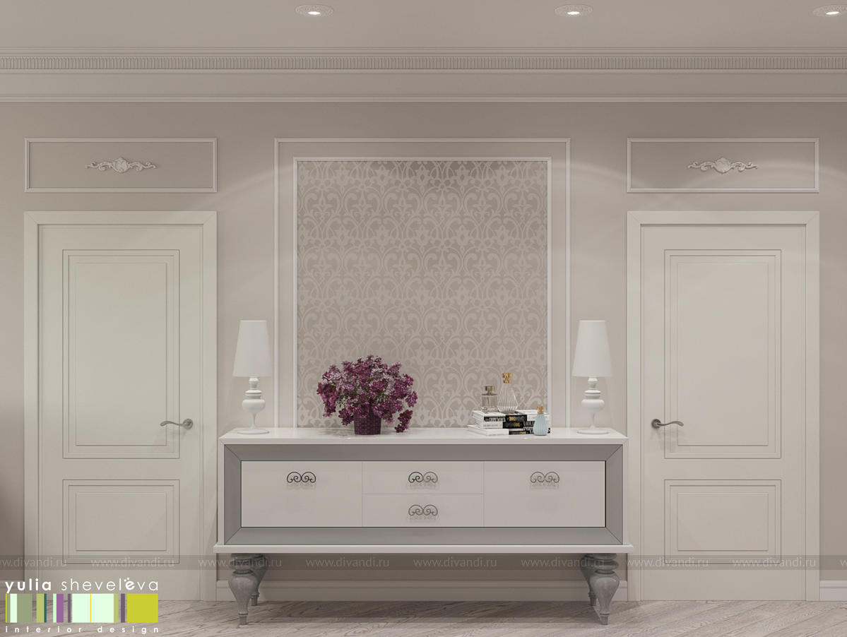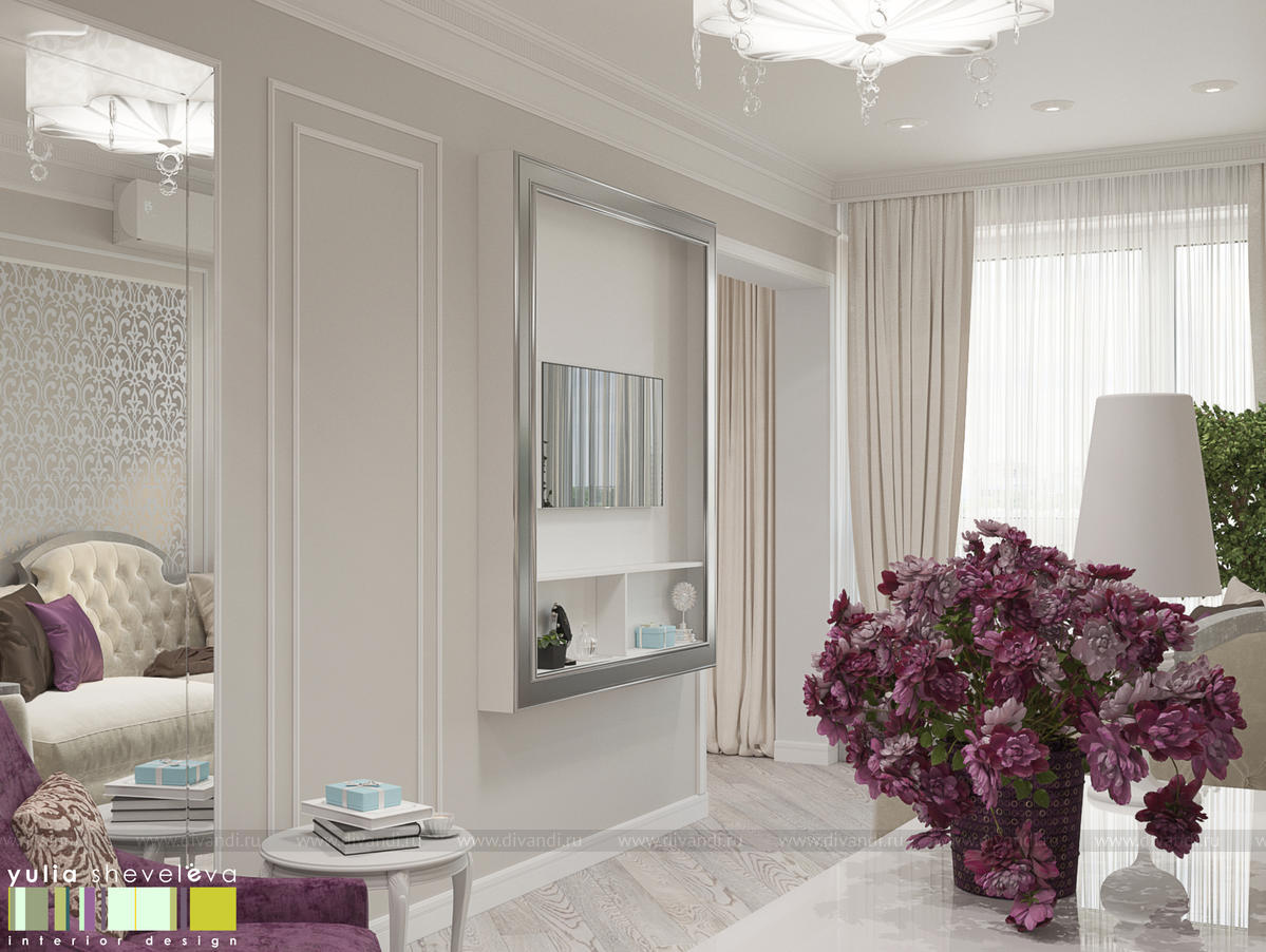 Все комнаты выдержаны в едином стиле легкой классики. Стены богато украшены молдингами и зеркалами. Несмотря на небольшие габариты квартиры, она получилась очень уютной и нарядной, и в то же время не перегружена деталями.
