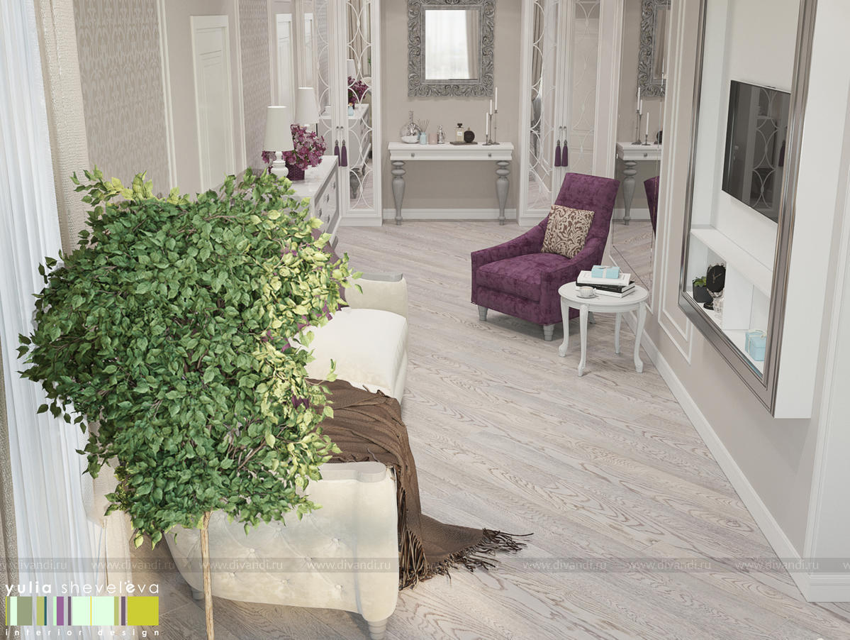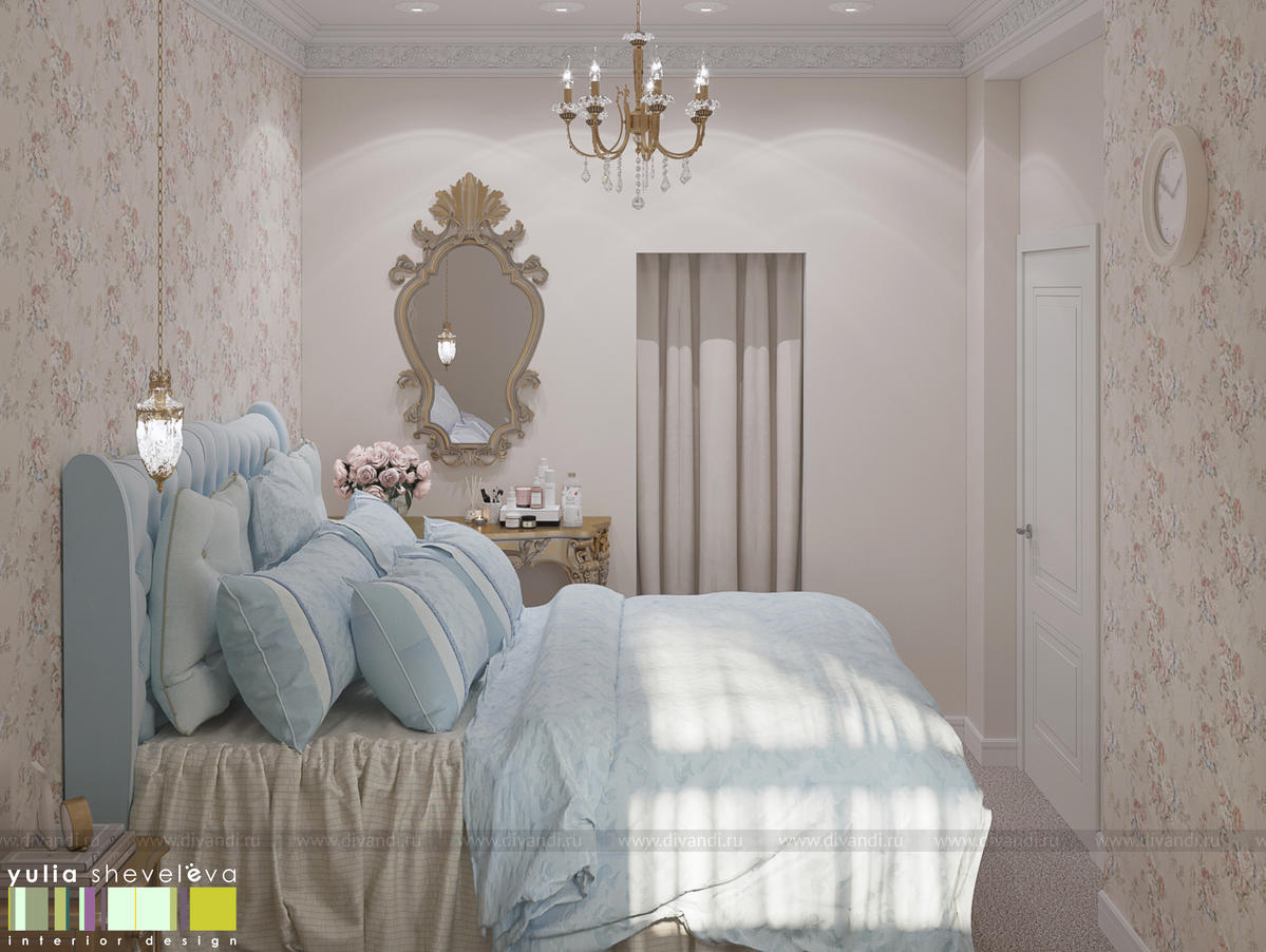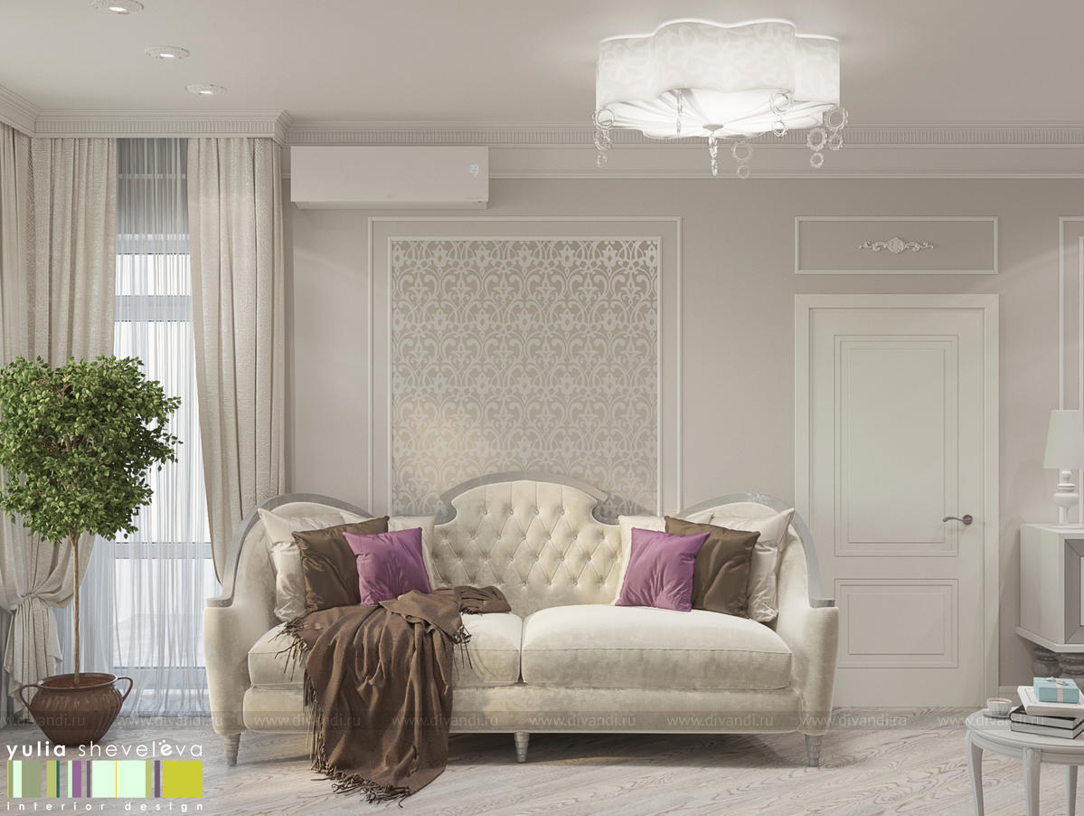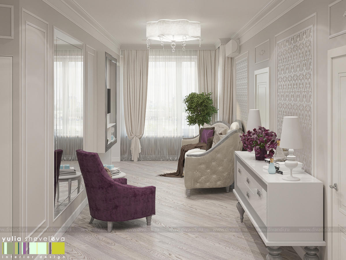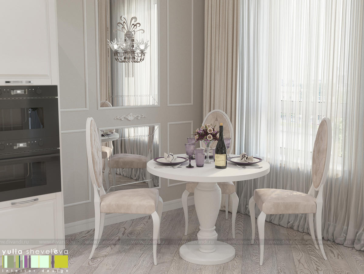 Все комнаты выдержаны в едином стиле легкой классики. Стены богато украшены молдингами и зеркалами. Несмотря на небольшие габариты квартиры, она получилась очень уютной и нарядной, и в то же время не перегружена деталями.