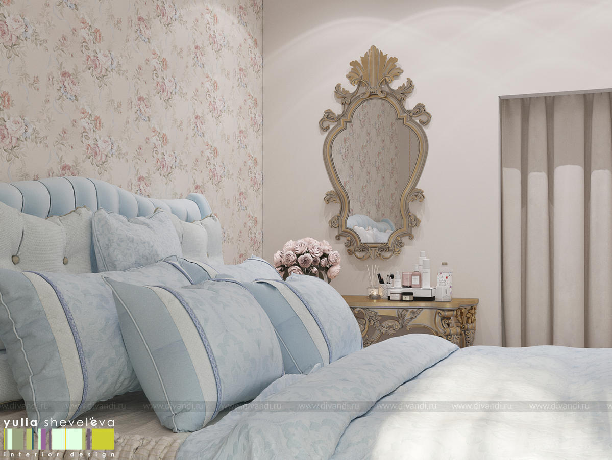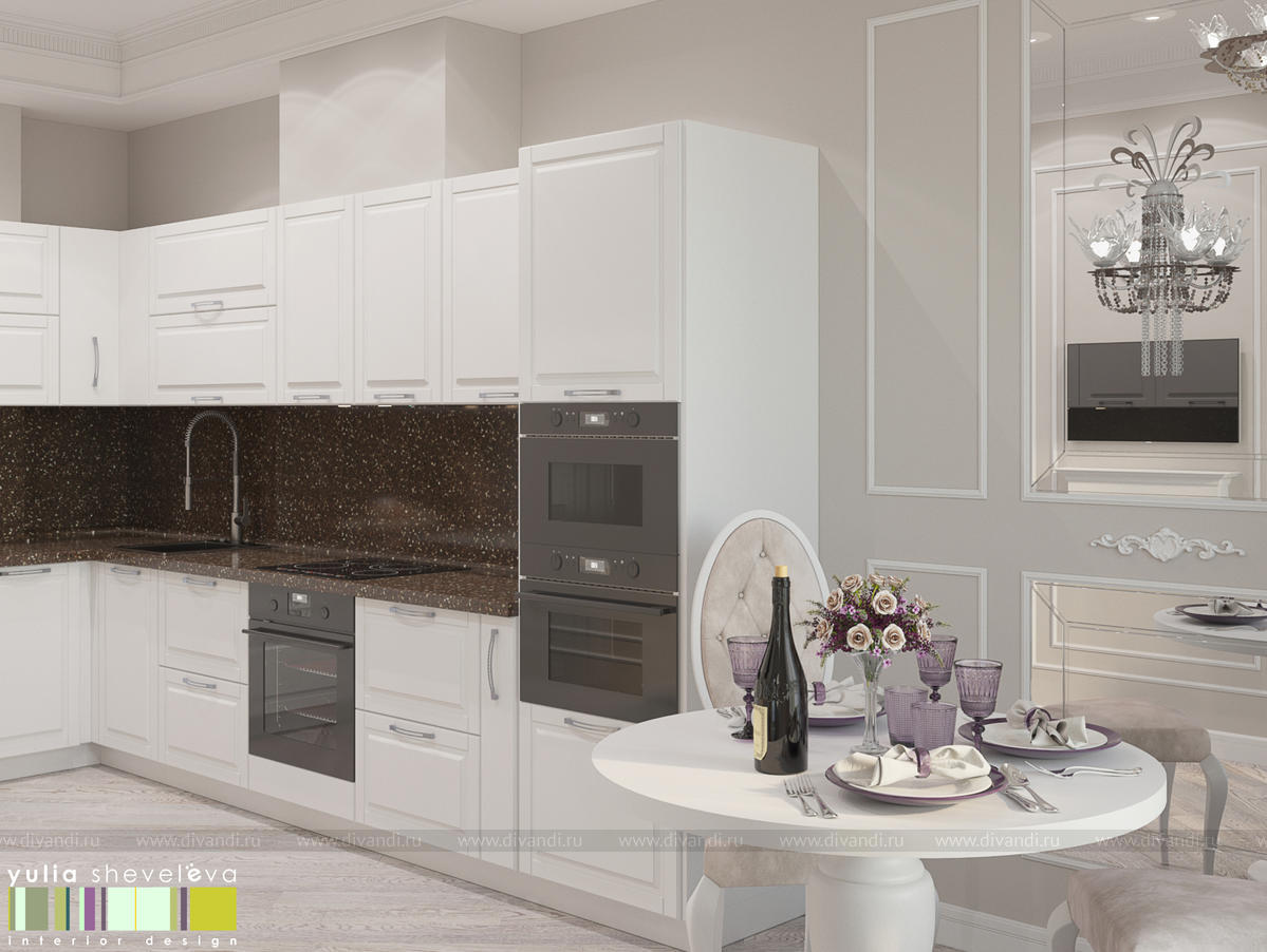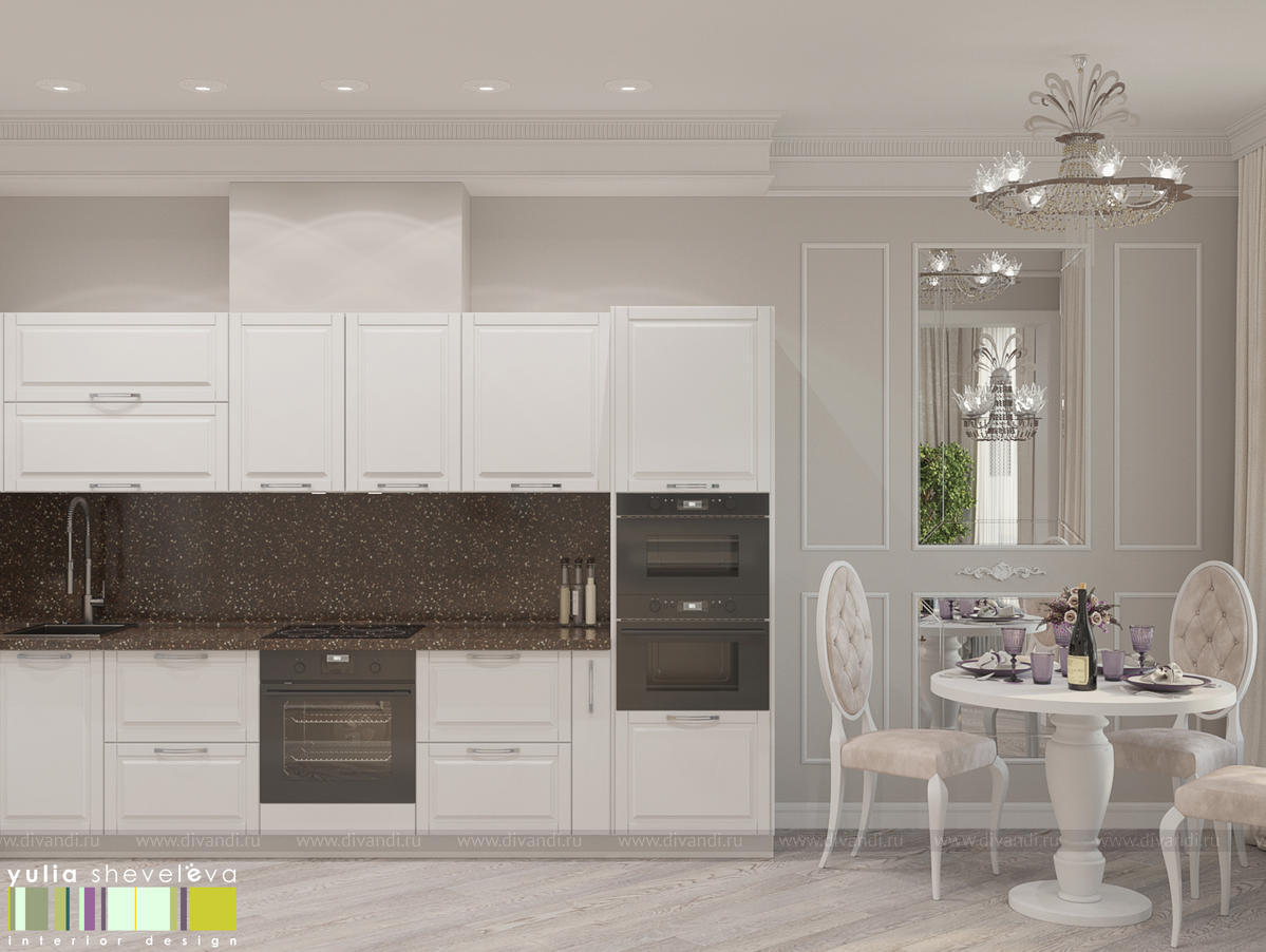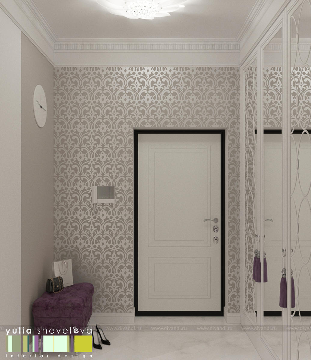 Все комнаты выдержаны в едином стиле легкой классики. Стены богато украшены молдингами и зеркалами. Несмотря на небольшие габариты квартиры, она получилась очень уютной и нарядной, и в то же время не перегружена деталями.