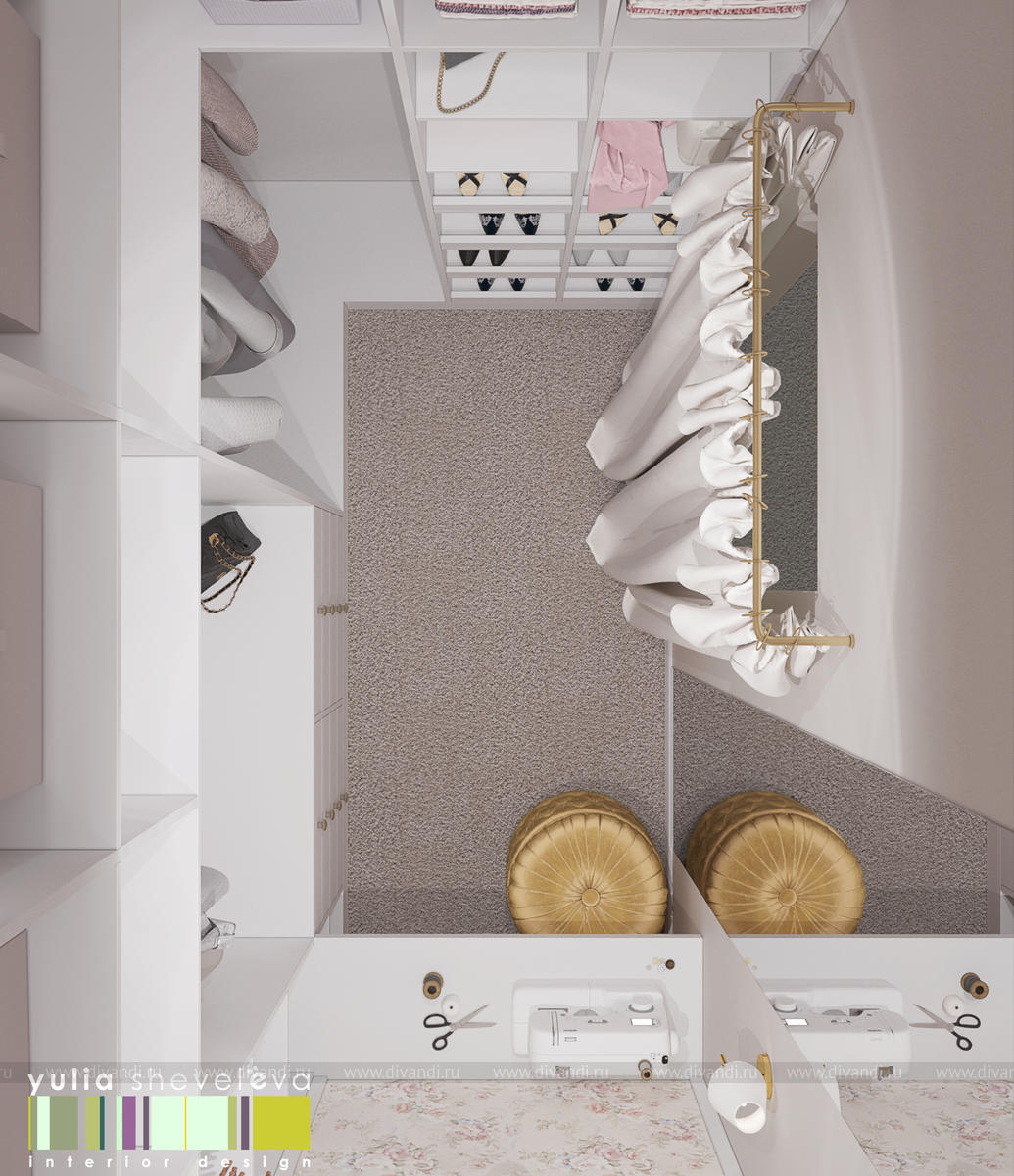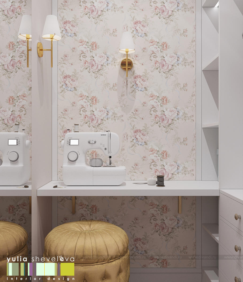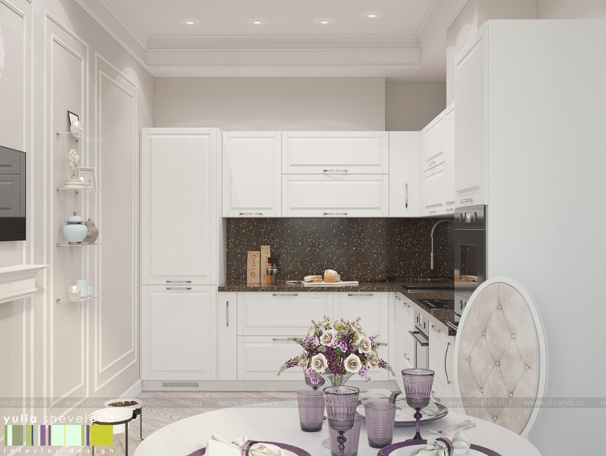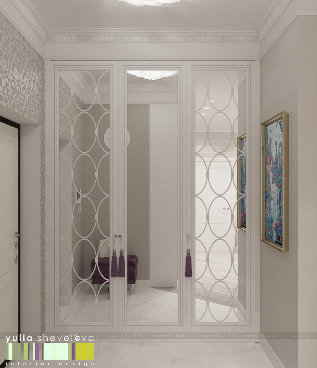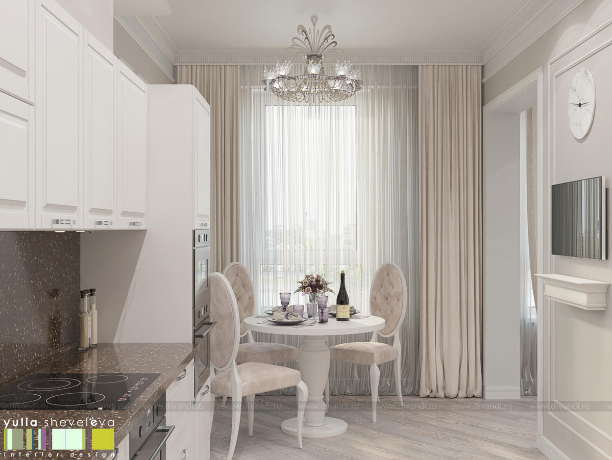Все комнаты выдержаны в едином стиле легкой классики. Стены богато украшены молдингами и зеркалами. Несмотря на небольшие габариты квартиры, она получилась очень уютной и нарядной, и в то же время не перегружена деталями.