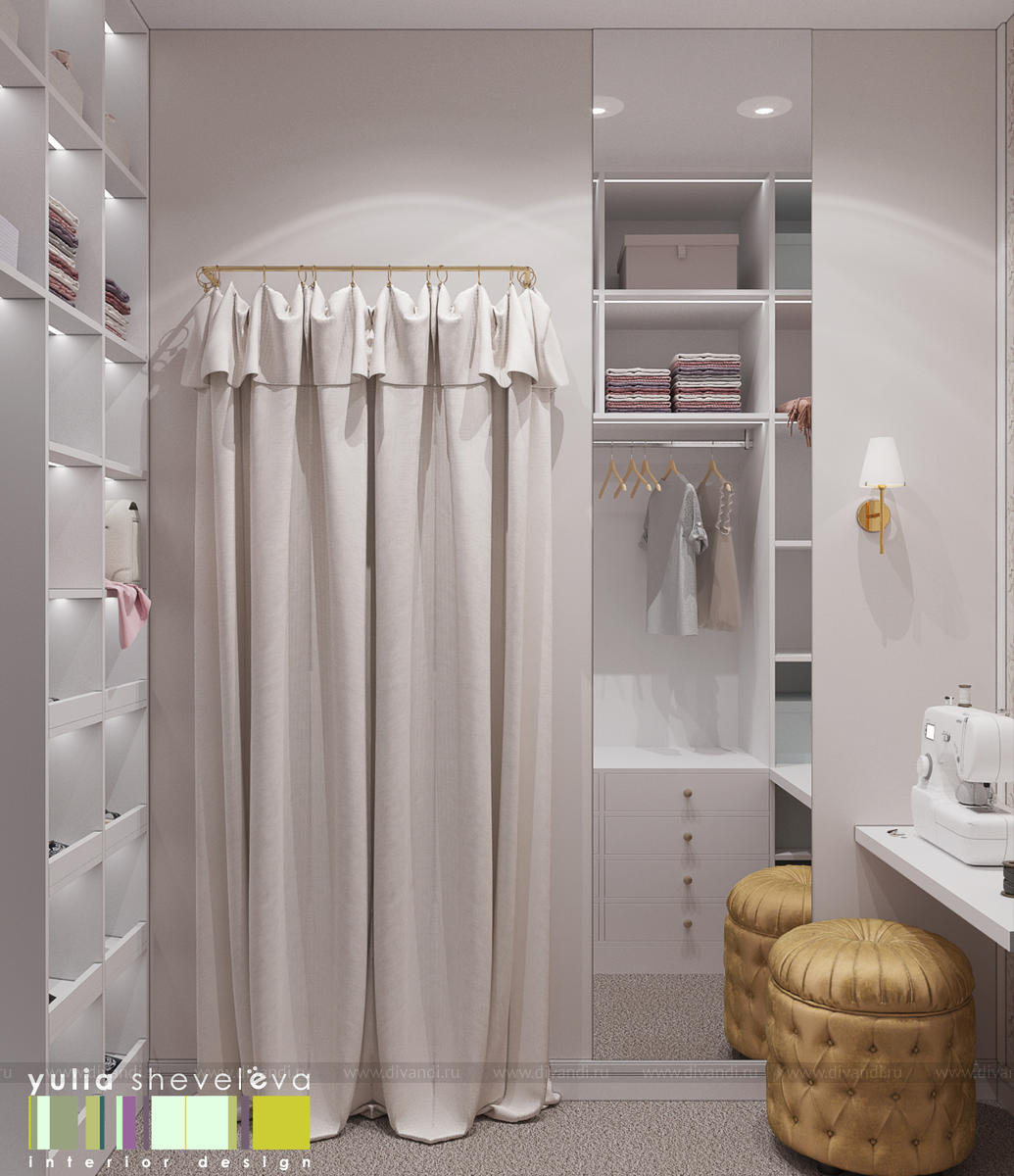 В квартире была сделана небольшая перепланировка. Увеличена гостиная, за счет холла; в спальне проем был сформирован со стороны гостиной, и благодаря этому удалось сделать дополнительно гардеробную комнату. Гостиная объединена с кухней, а бывший вход на кухню дал возможность увеличить второй санузел, в котором расположилась прачечная зона.