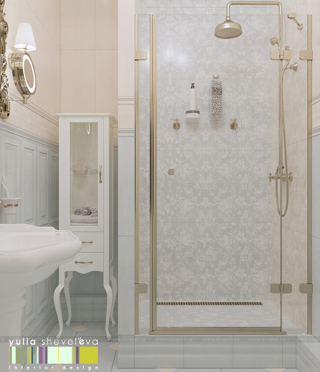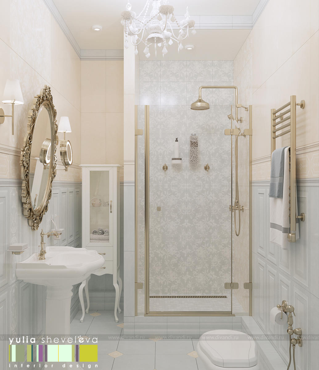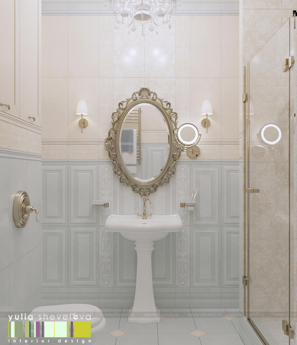 Ванная комната получилась очень нежной и красивой. Сочетание цветов бежевого с голубым, на фоне блеска латунных смесителей и аксессуаров, создает по истине изысканный образ.