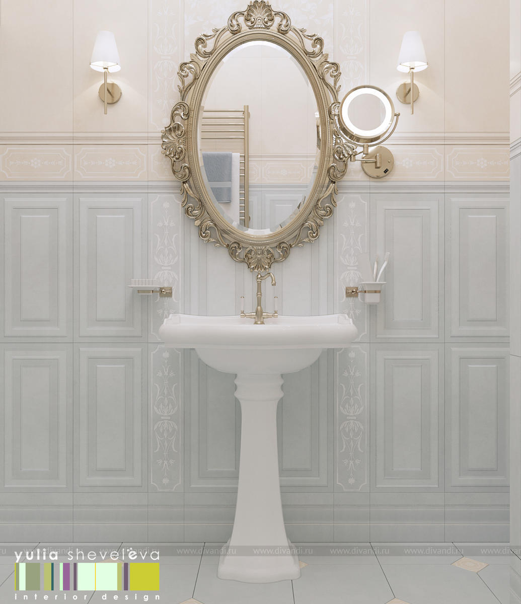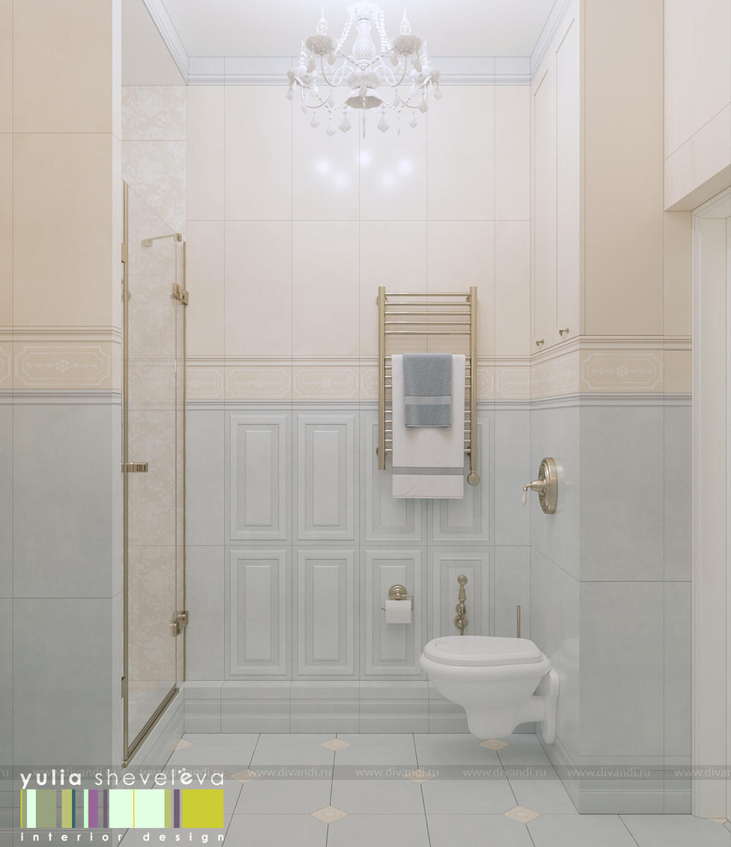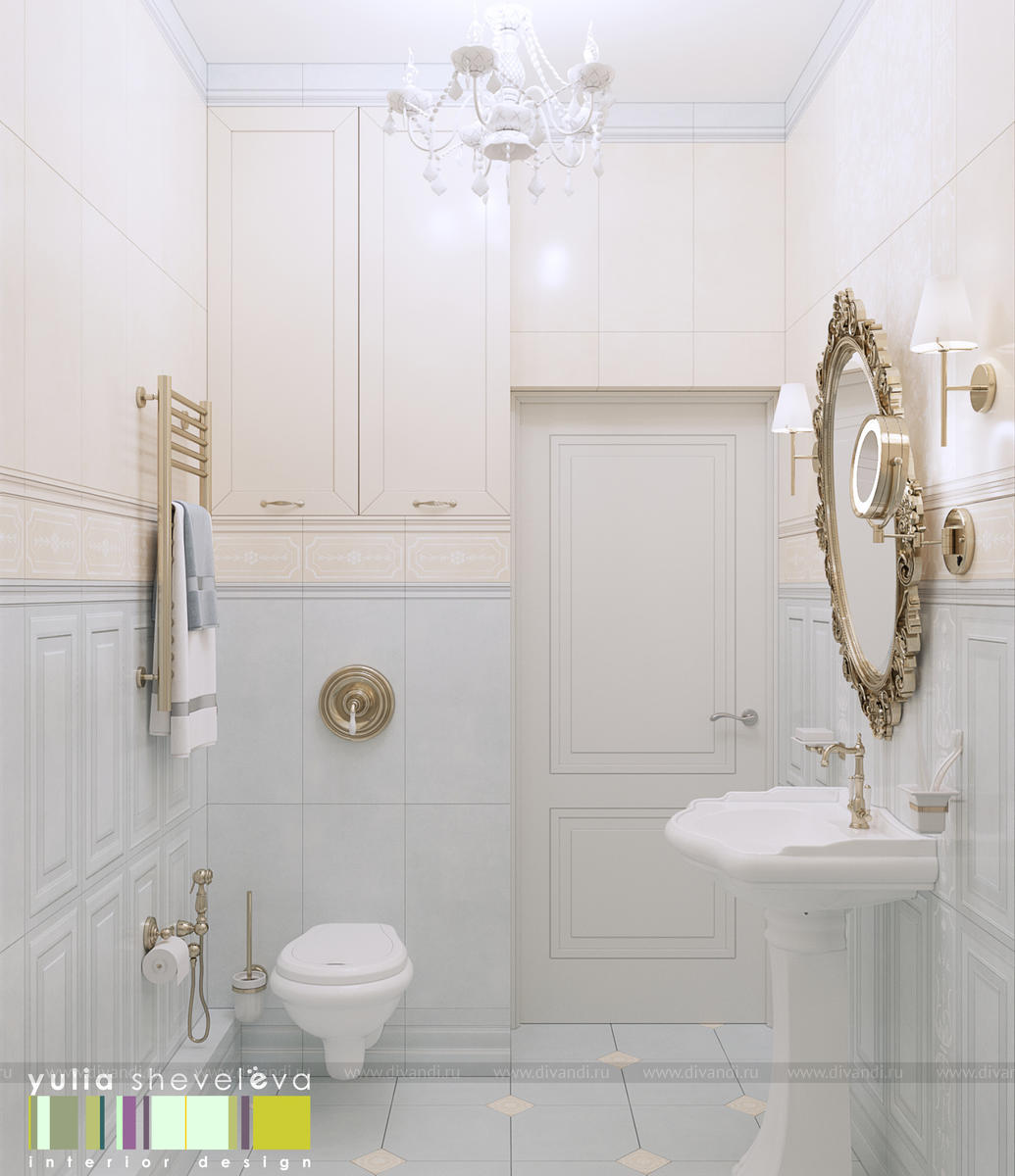 Ванная комната получилась очень нежной и красивой. Сочетание цветов бежевого с голубым, на фоне блеска латунных смесителей и аксессуаров, создает по истине изысканный образ.