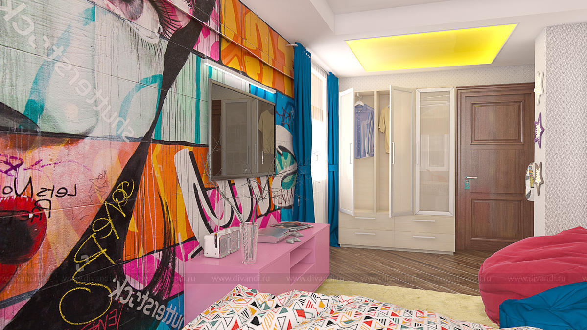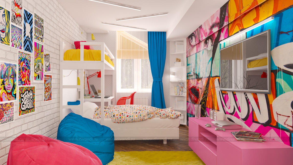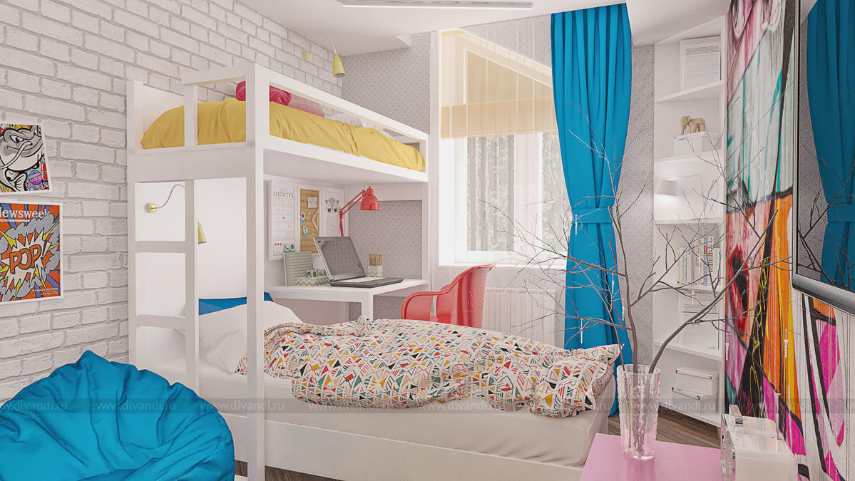 В большом доме бабушки требовалось переделать из кабинета детскую. Внучки приезжают на выходные, пребывание девочек планируется временное, но в тоже время перед дизайнером было поставлено много задач. В итоге в комнате площадью меньше 14 кв.м. расположили два спальных места, обустроили рабочую зону, предусмотрели место для игр и разместили телевизор с тумбой для игровой приставки, а также использовали существующие шкафы. В итоге дизайн комнаты получился функциональный, насыщенный и яркий.