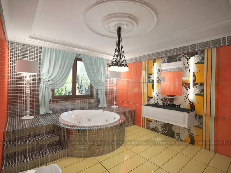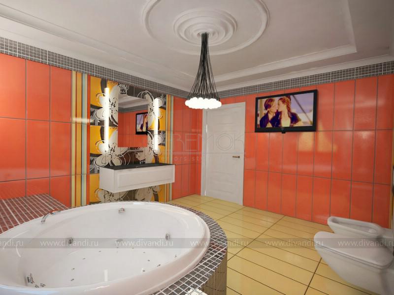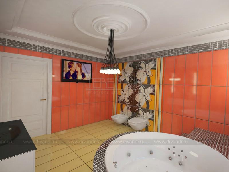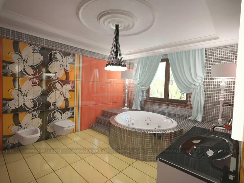 Санузел оформлен в ярких, красочных тонах. Фабрика Iris Ceramica, коллекция Feel - вершина эволюции настенных коллекций данной фабрики, серия впервые была представлена на Cersaie 2008. Безупречный стиль и осознанная роскошь становятся великолепных украшением этого интерьера. Светильник 85 lamps разработал дизайнер Руди Грауманс. Он просто взял 85 обычных лампочек и соединил их в один пучок, объединил контакты и подвесил это сооружение на потолок.