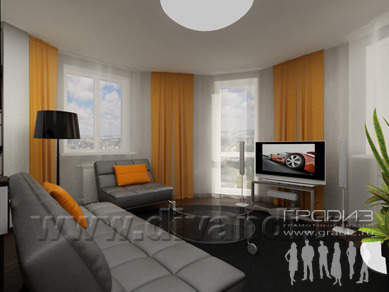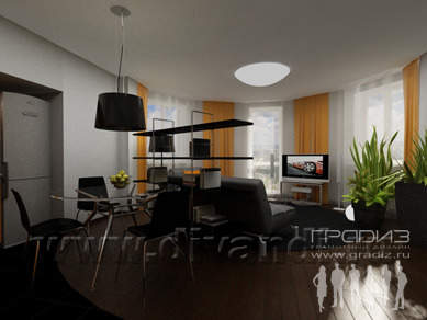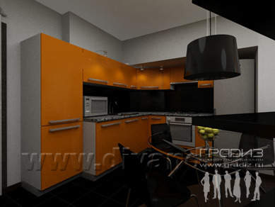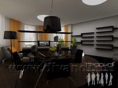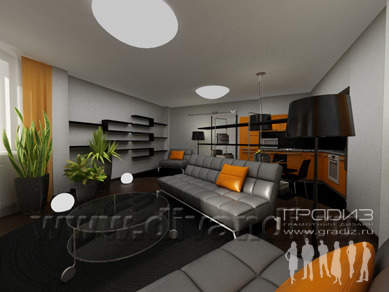 Гостиная стала гордостью хозяина, местом для приема гостей. Элегантное сочетание ярко-оранжевого, черного и стального цветов придало этой комнате живость и нетрадиционность. Интересной стала и геометрия гостиной: минималистичный интерьер с использованием простых геометрических фигур: прямоугольника, квадрата и круга отражает характер хозяина, его стиль и творческую натуру.