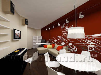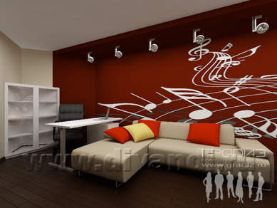 Кабинет продолжает общую концепцию интерьера квартиры. Оформление этого пространства подсказала сфера деятельности хозяина – музыка. Оригинальность спальне придают разноуровневые панели с фотообоями, на которых изображены небо и море.