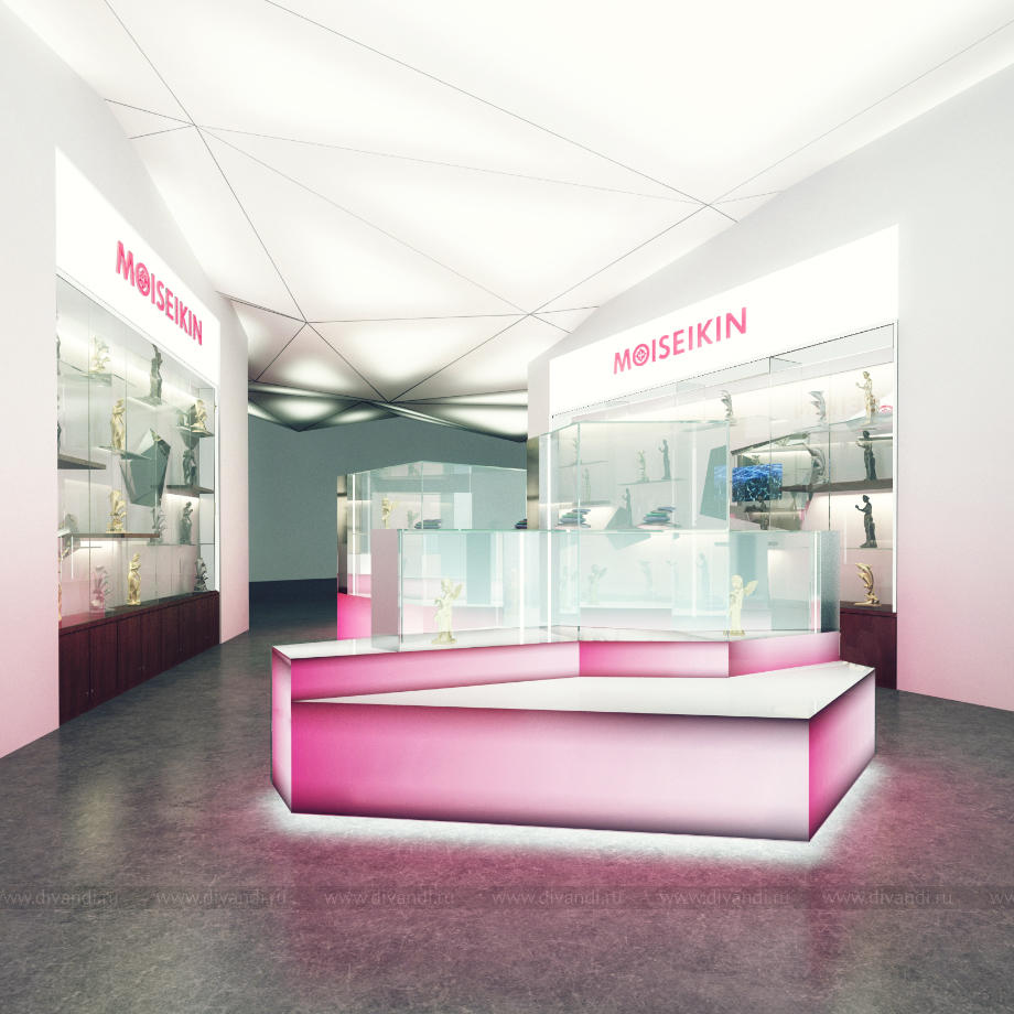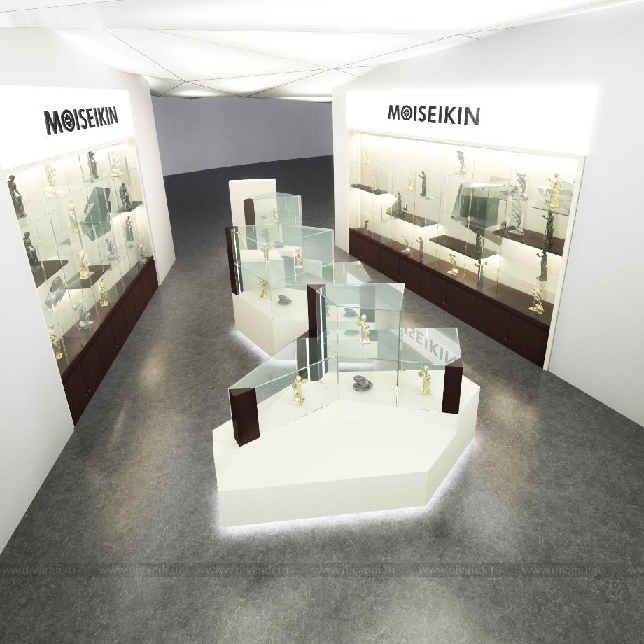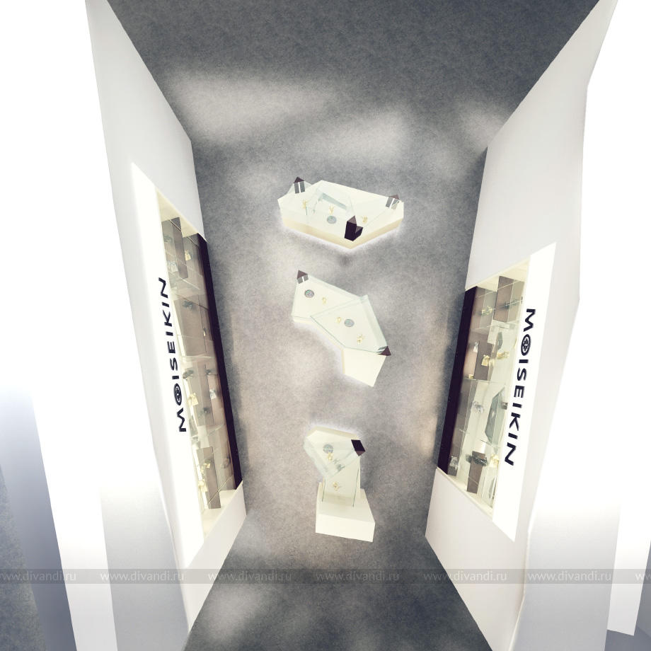 Дизайн магазина-салона ювелирных изделий и украшений интерьера в торговой зоне терминала А. Оригинальное торговое оборудование, лаконичные простые решения.