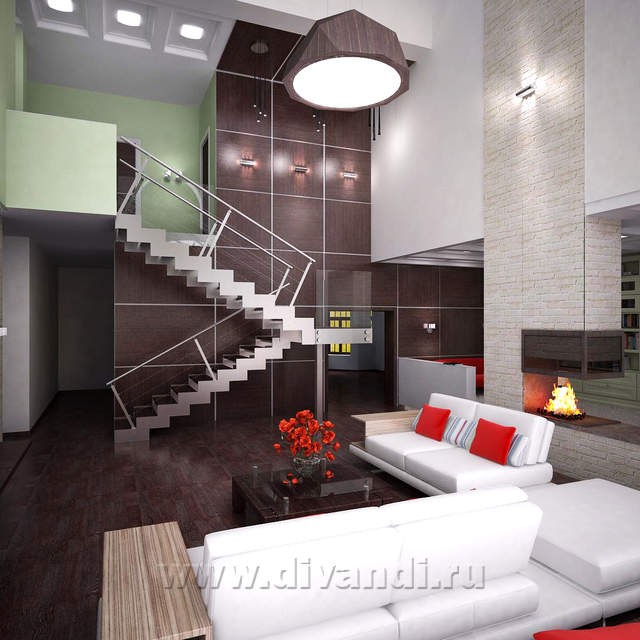 Загородный дом в современном стиле с просторной двусветной гостиной.