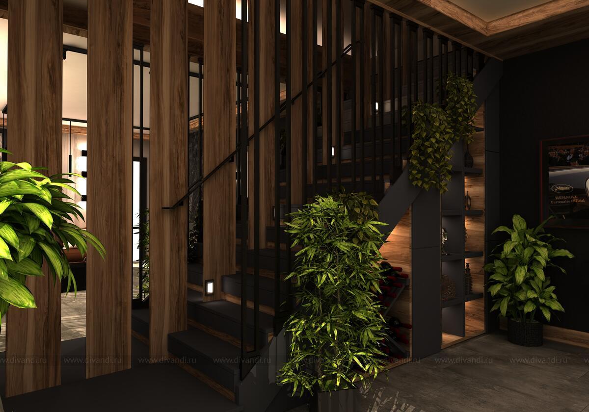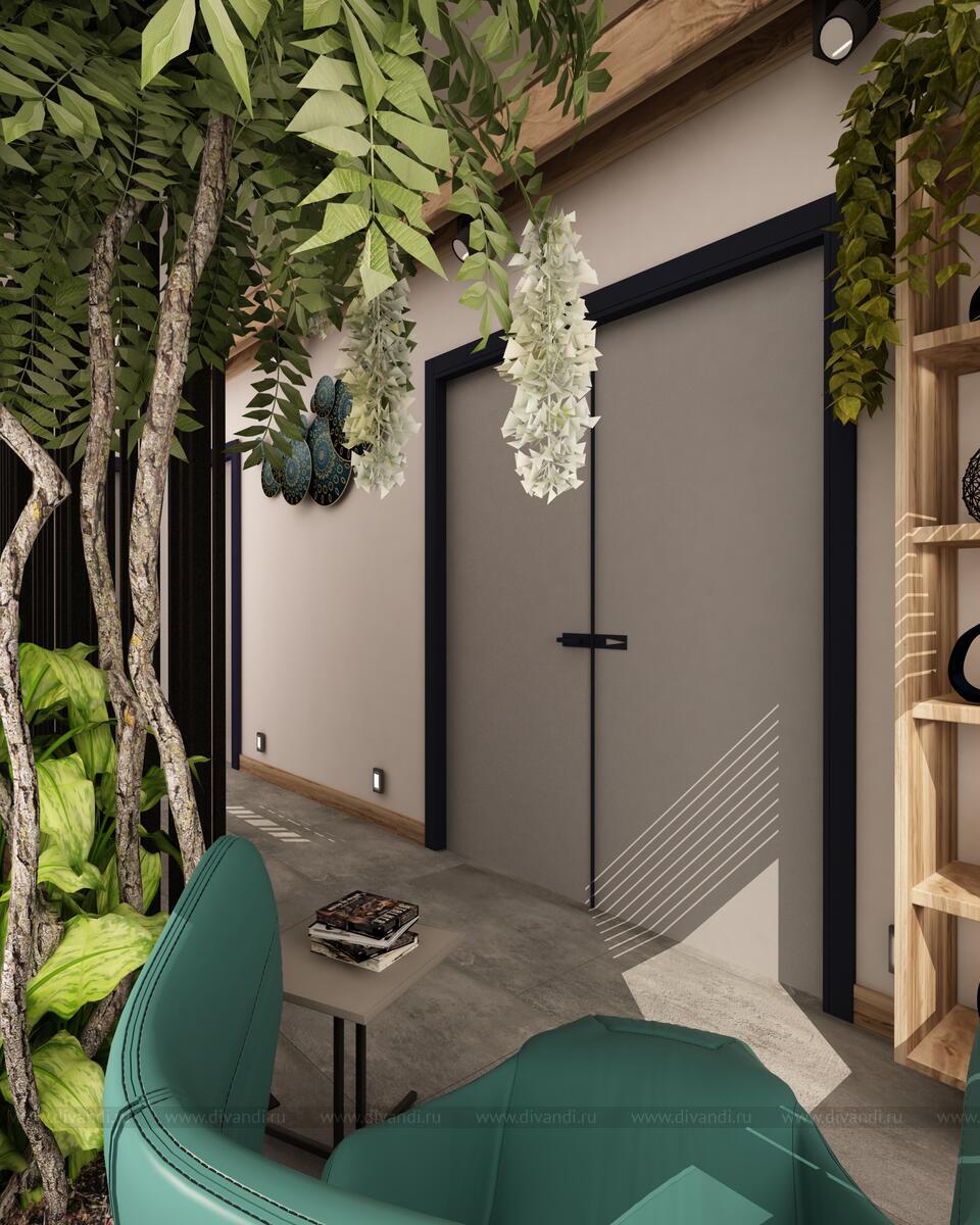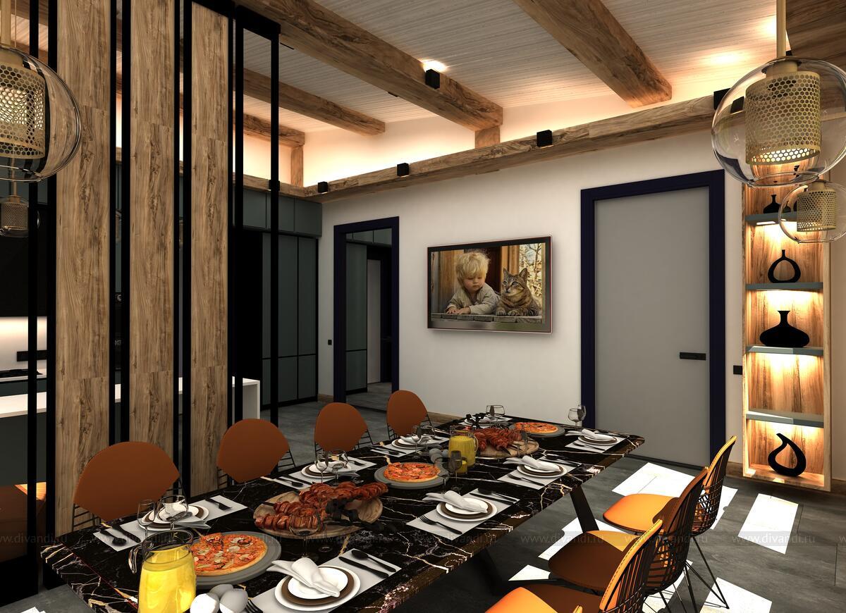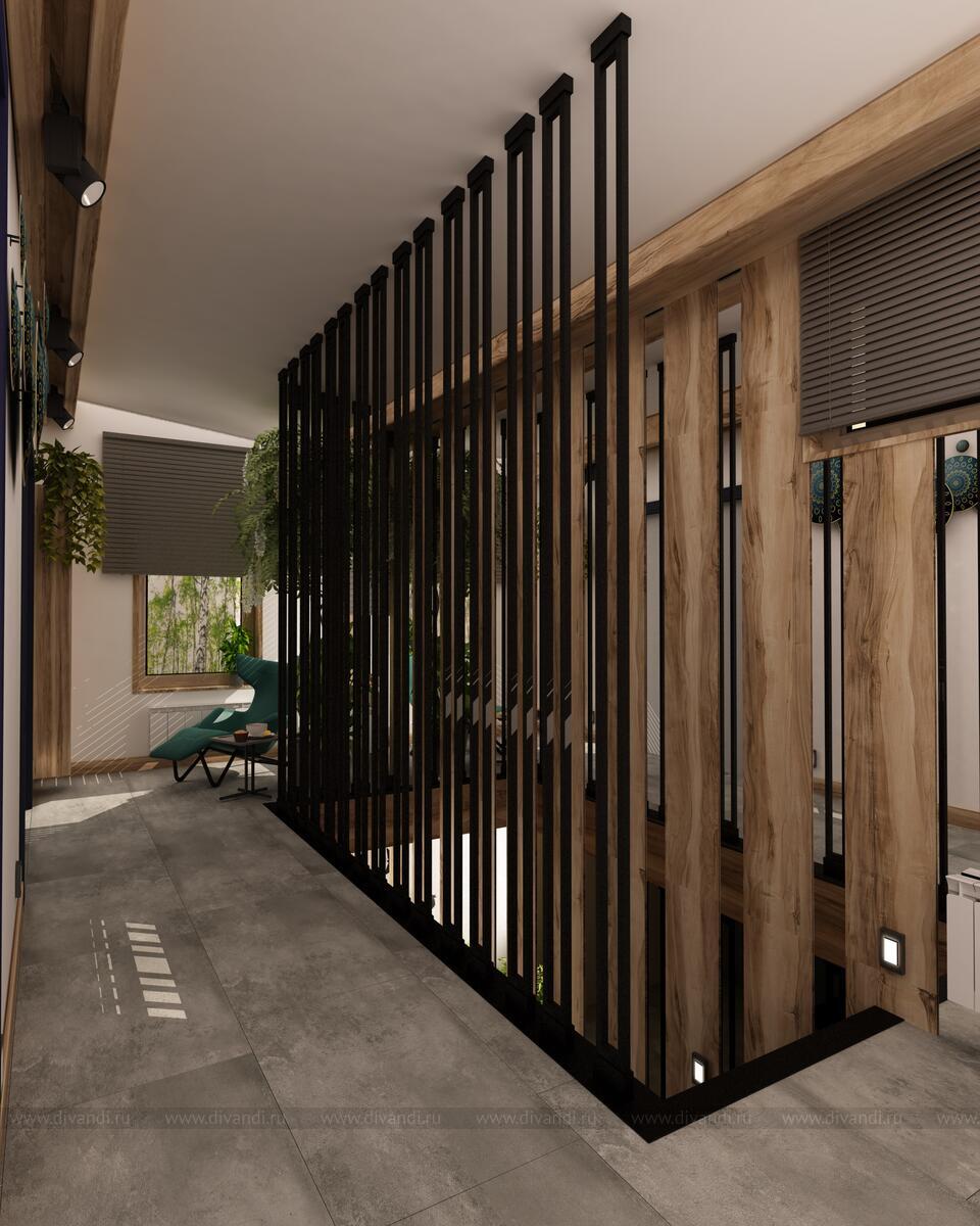 Зонирование сделала в виде перегородки из металла и вставок дерева, данное решение разделило две зоны, но не стало монументальным, так как есть просветы в перегородке и она легкая визуально.????