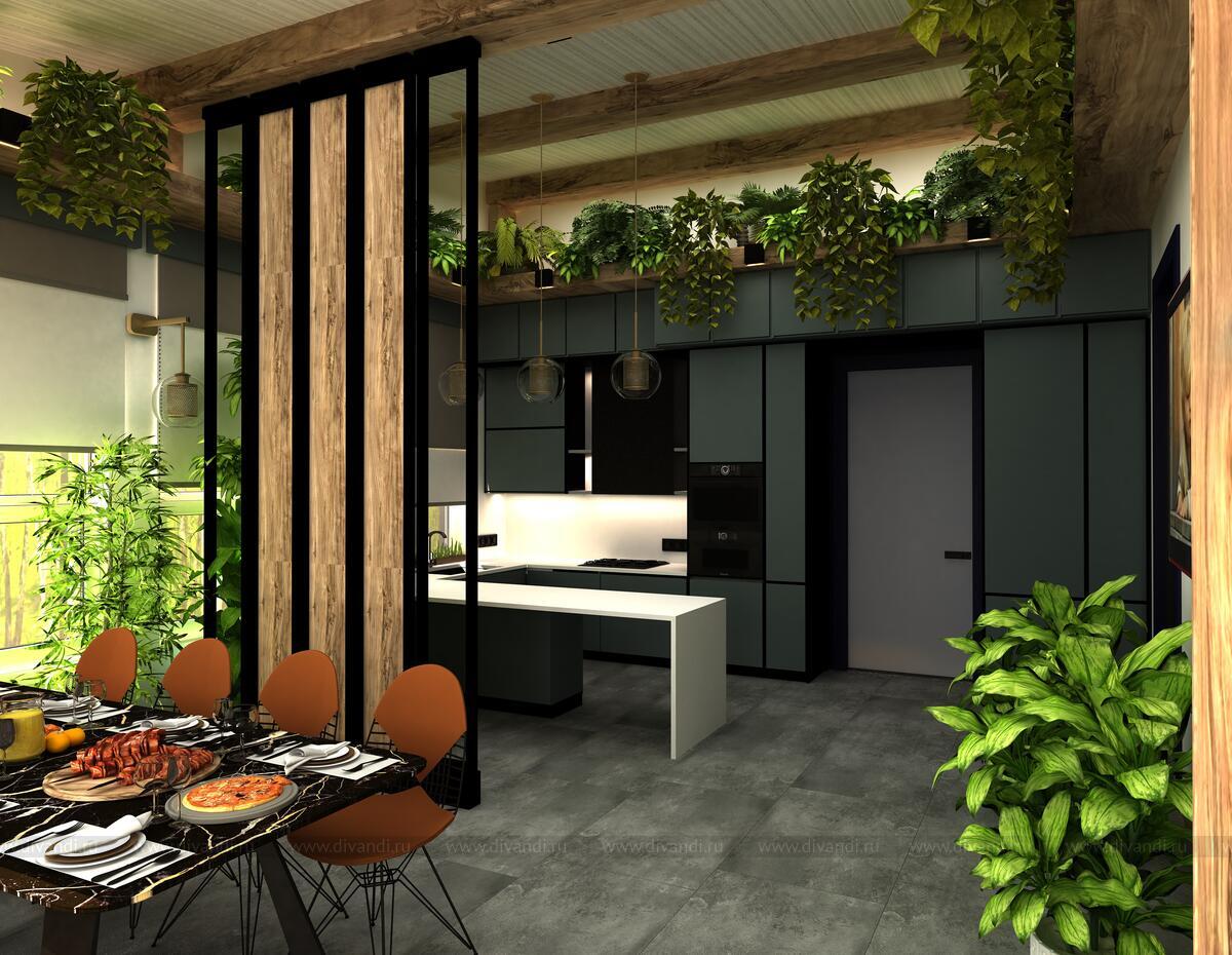 Тип проекта: загородный дом, кухня, гостиная