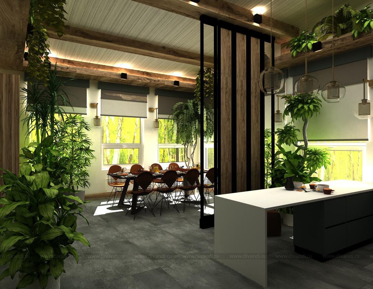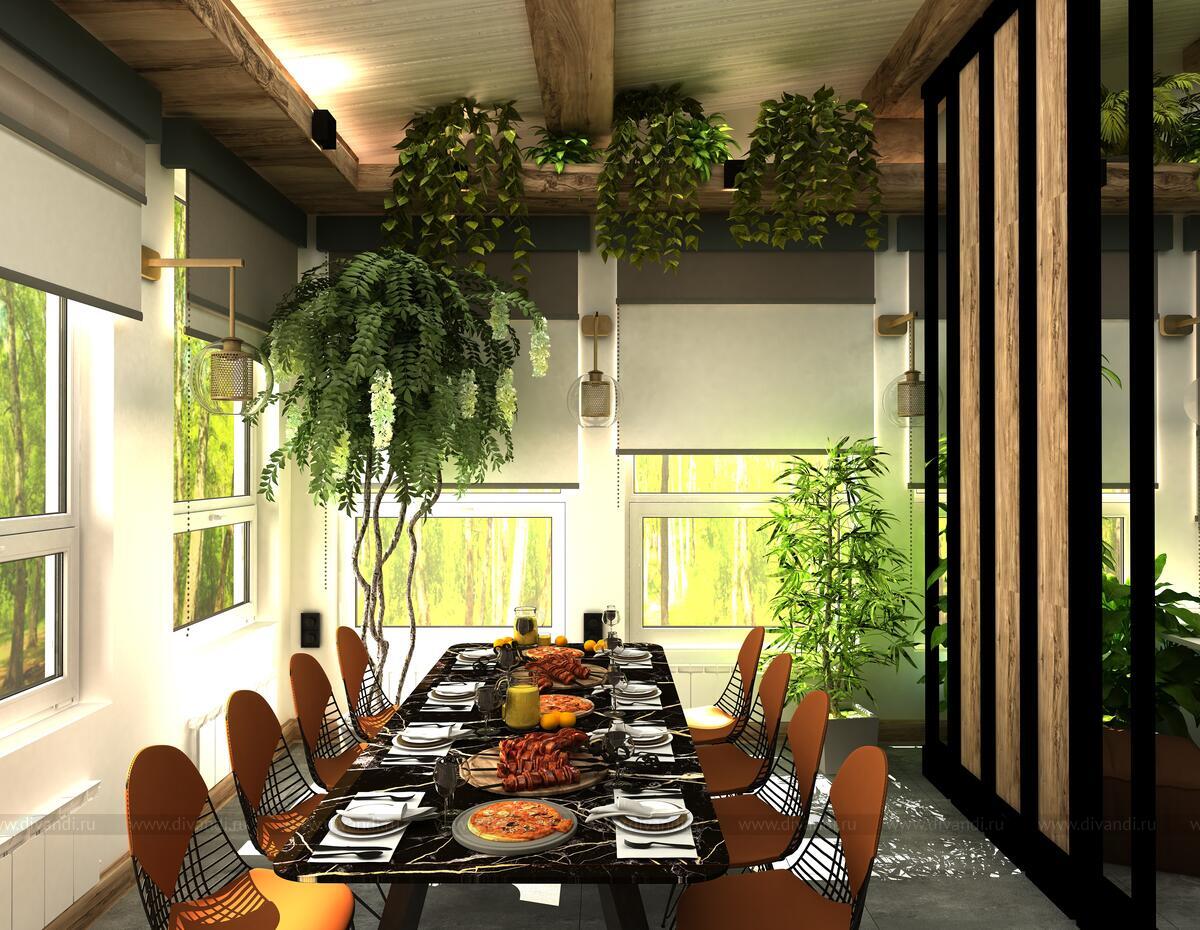 Задачи стояли: использовать практичные материалы на всех поверхностях, декор использовать натуральный, преимущественно массив, сделать зонирование на веранде – столовой зоны от кухни.????