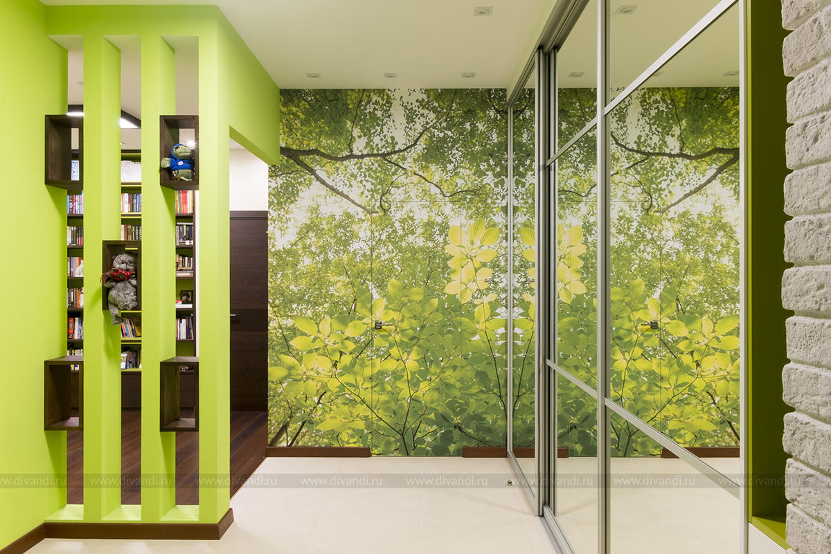 Прихожая проектировалась в "свежих" зеленых оттенках. Панно прячет дверь в кладовую.