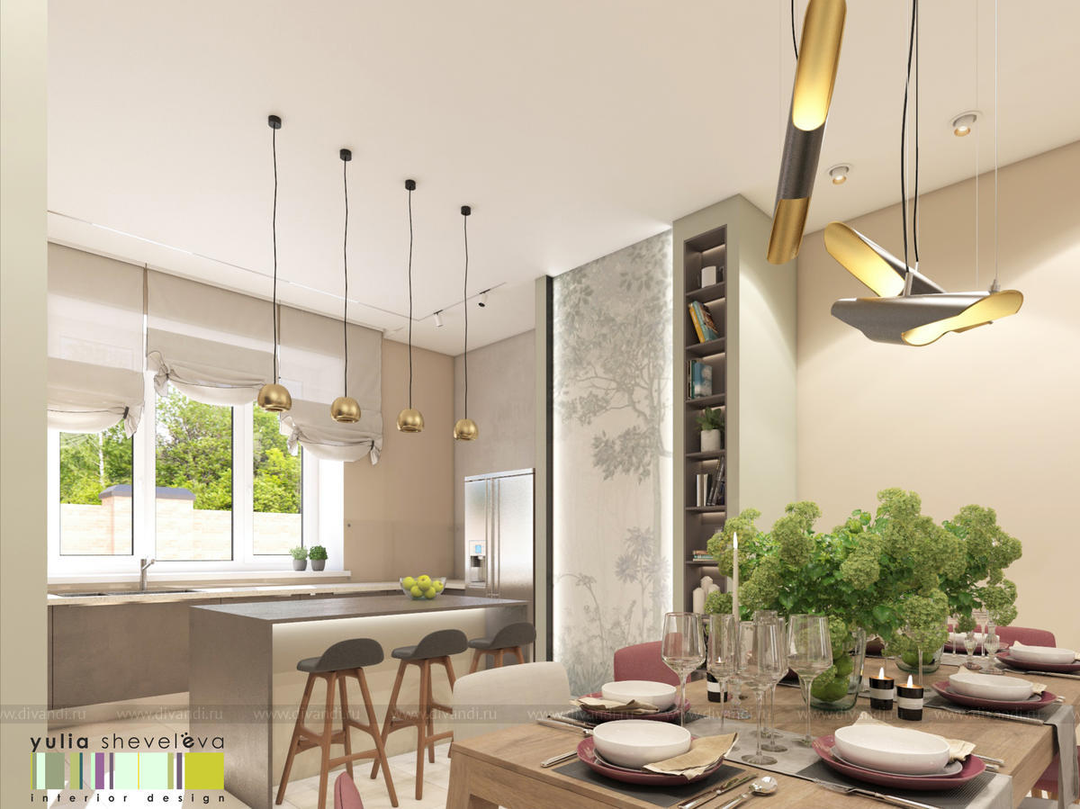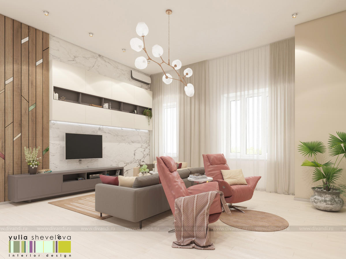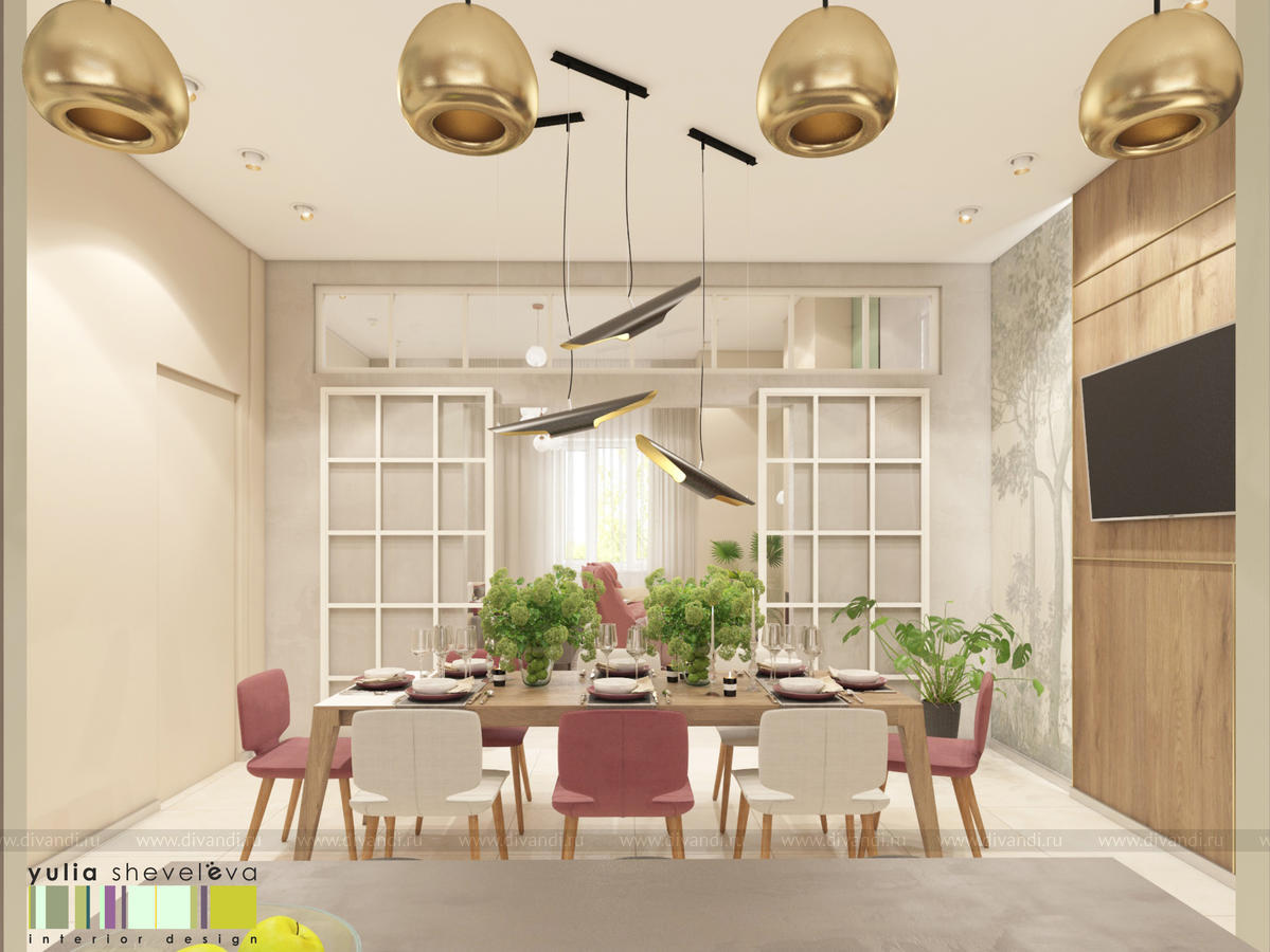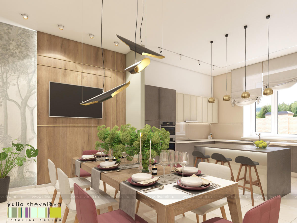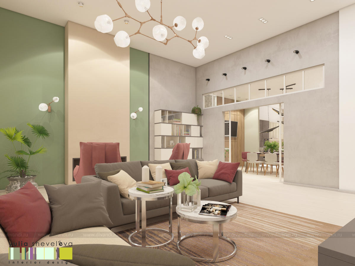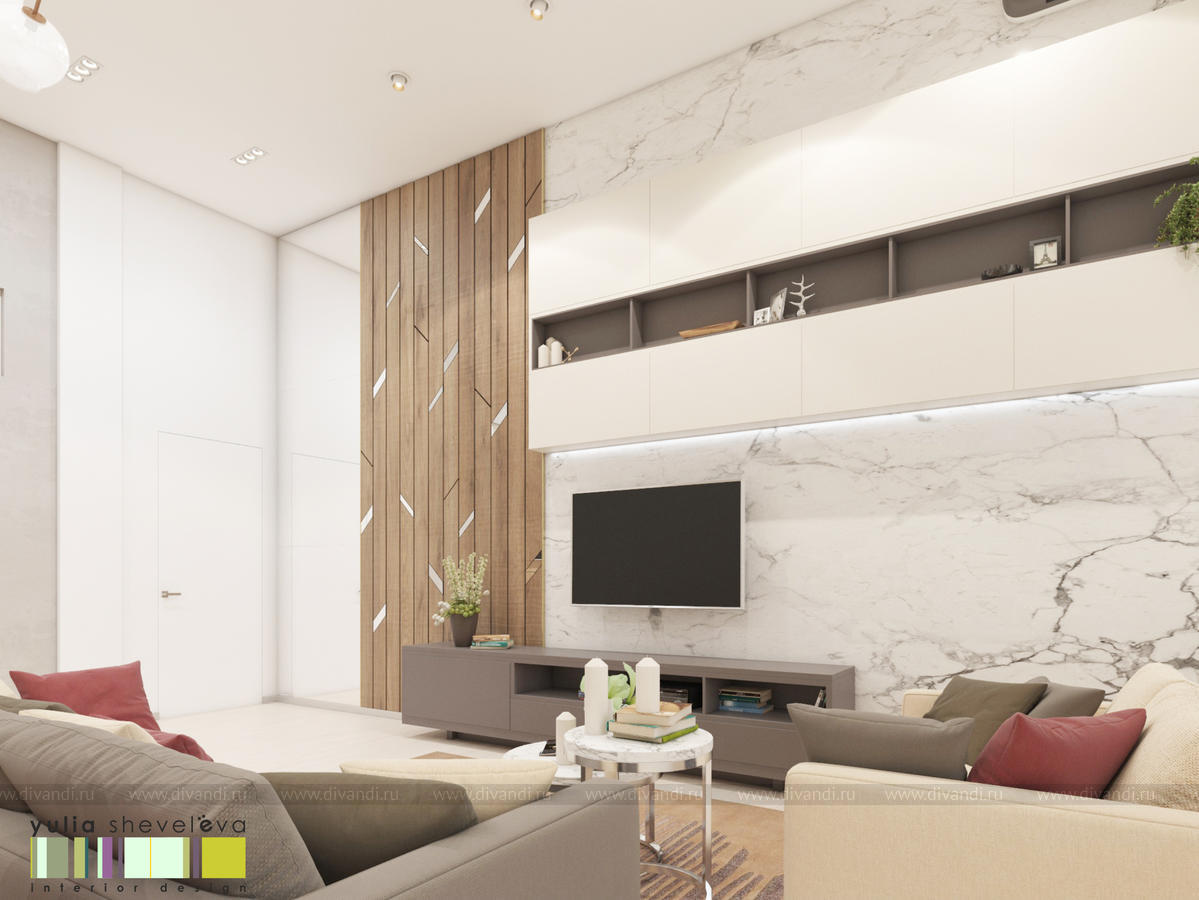 Интерьер дома было решено выполнить в современном стиле, с яркими акцентами и не перегруженного деталями в то же время. На первом этаже расположились гостиная и кухня, гостевой санузел. Здесь очень хорошая высота потолка - около четырёх метров, очень хотелось ее подчеркнуть красивыми интерьерными решениями. Так появились деревянные панели с зеркальными вставками и панно, имитирующее натуральный мрамор. Кухня-столовая спряталась за раздвижными дверцами.
