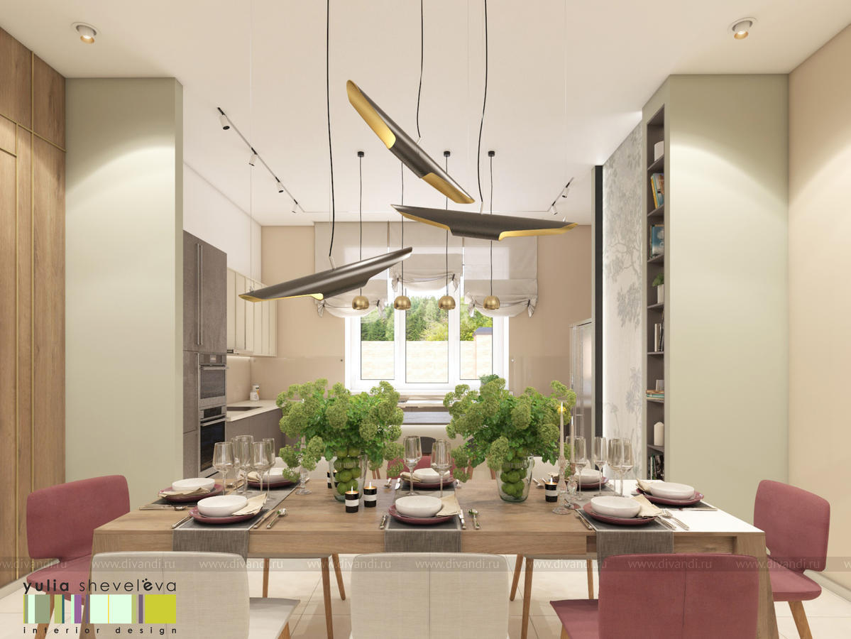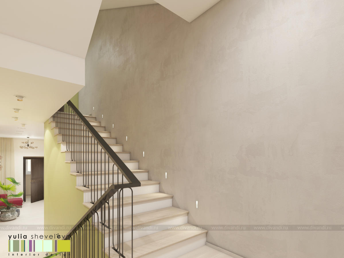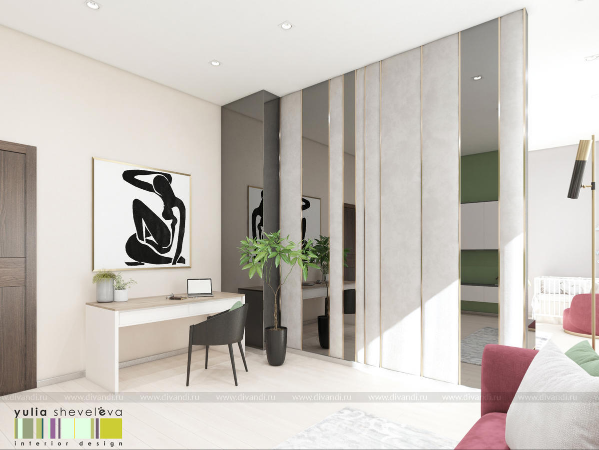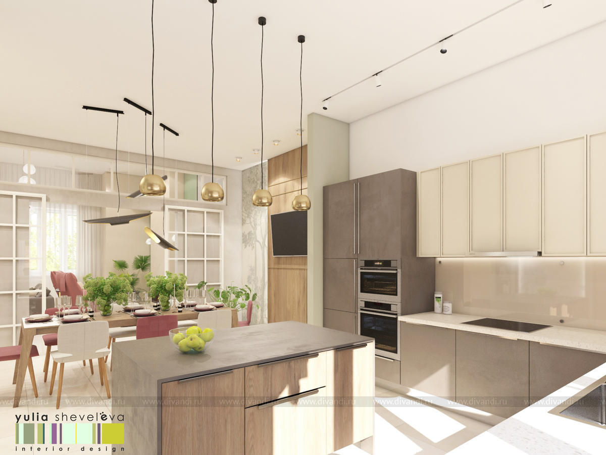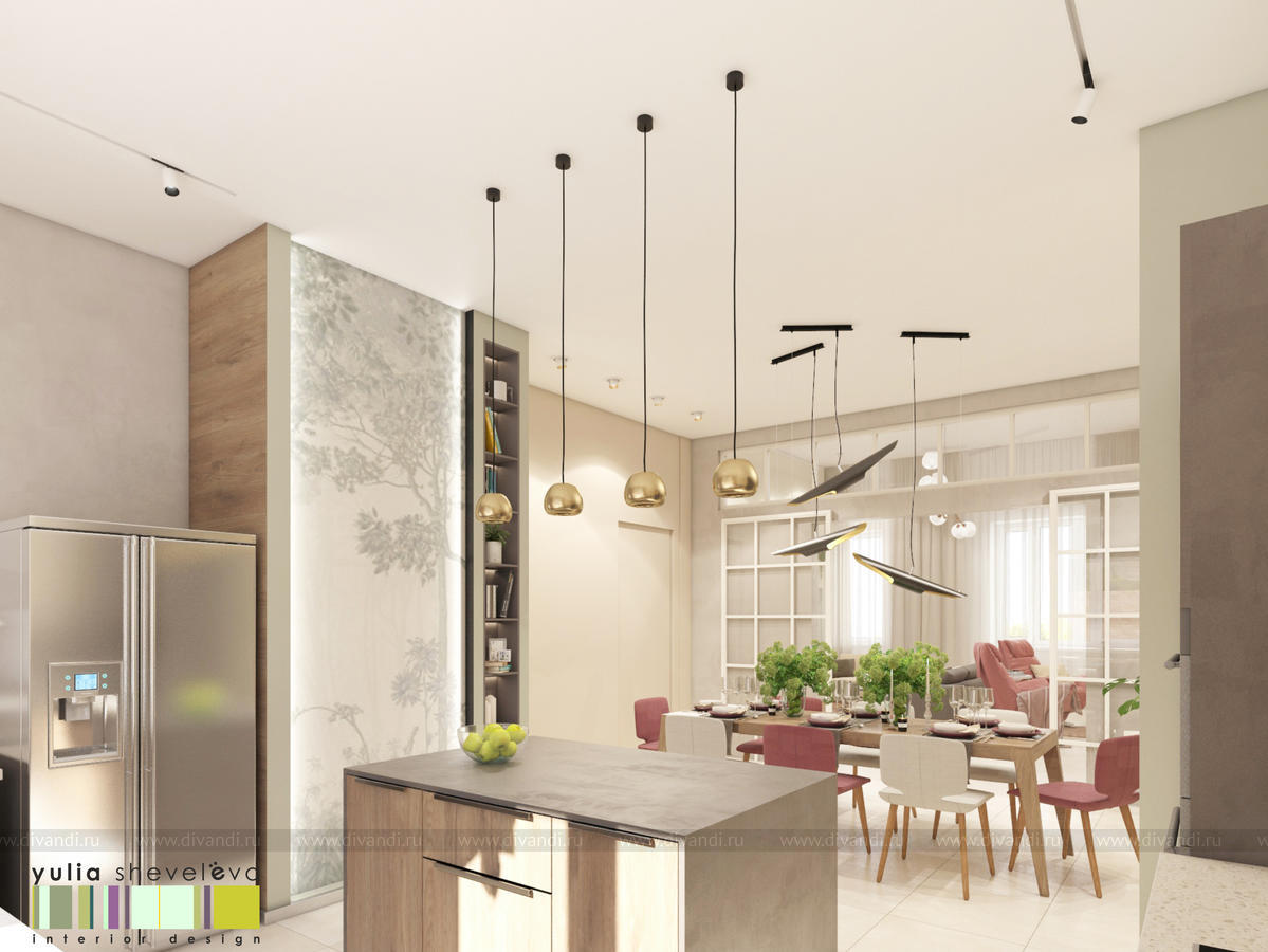 Интерьер дома было решено выполнить в современном стиле, с яркими акцентами и не перегруженного деталями в то же время. На первом этаже расположились гостиная и кухня, гостевой санузел. Здесь очень хорошая высота потолка - около четырёх метров, очень хотелось ее подчеркнуть красивыми интерьерными решениями. Так появились деревянные панели с зеркальными вставками и панно, имитирующее натуральный мрамор. Кухня-столовая спряталась за раздвижными дверцами.