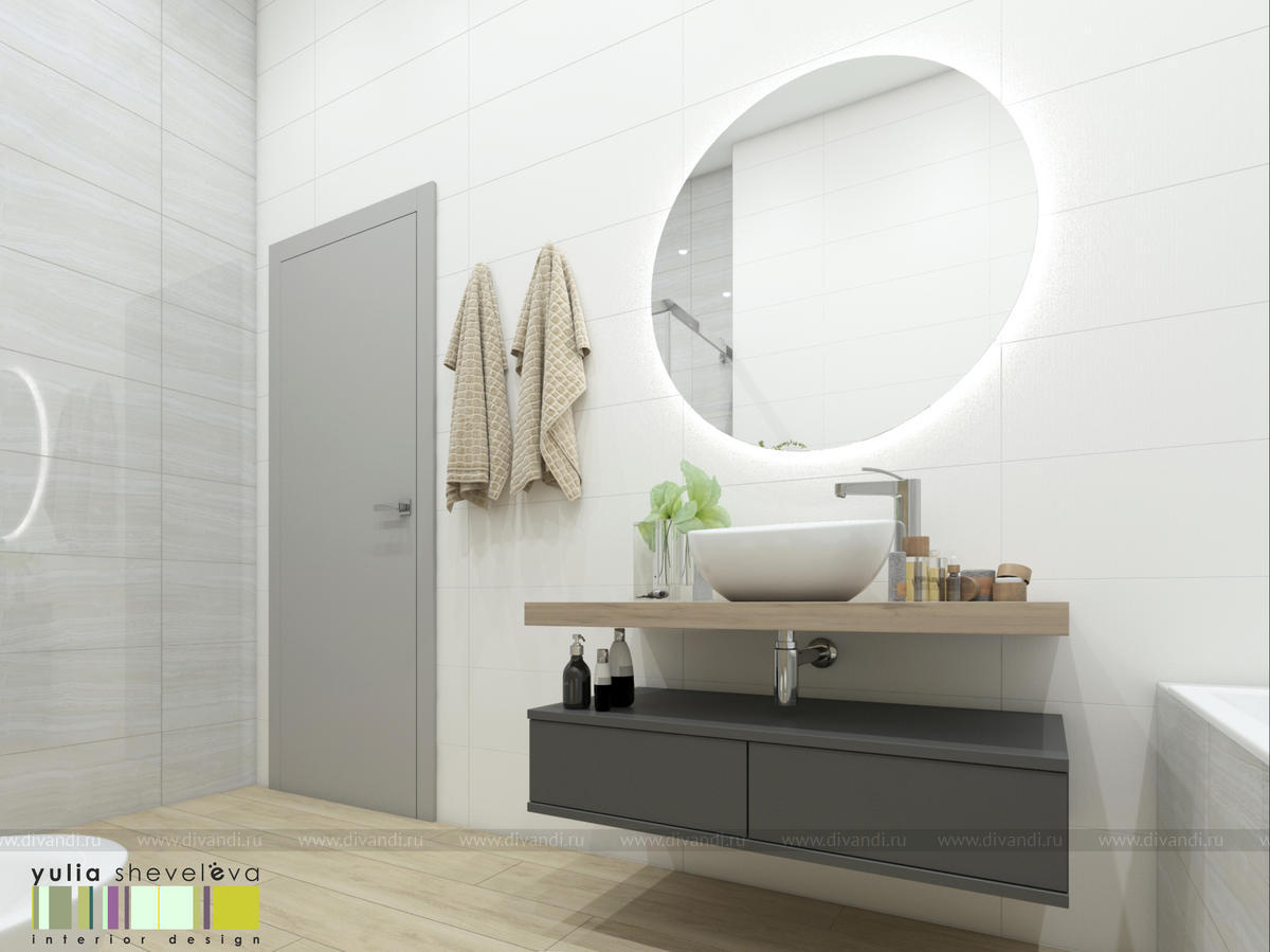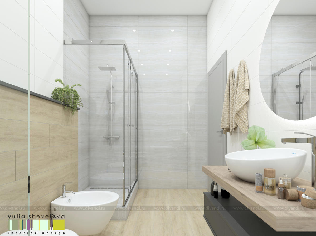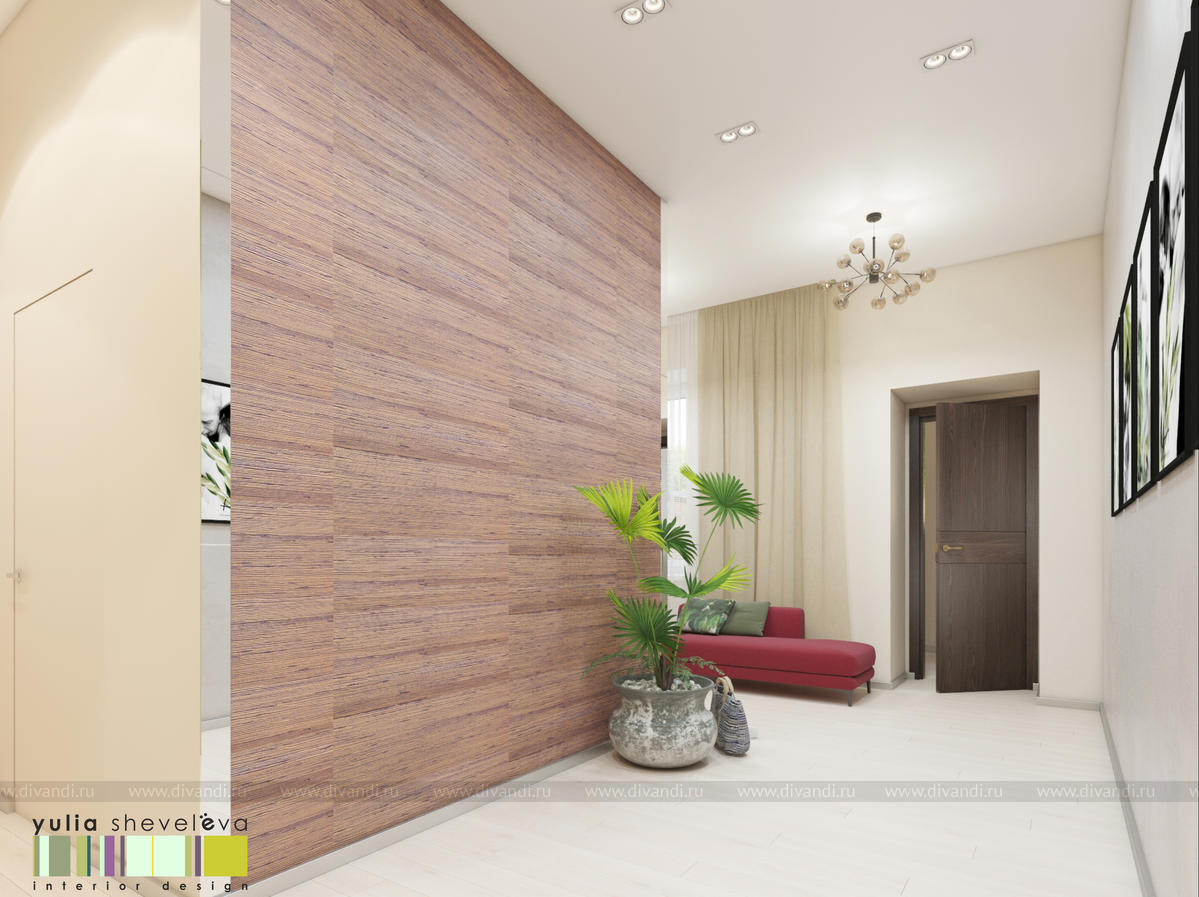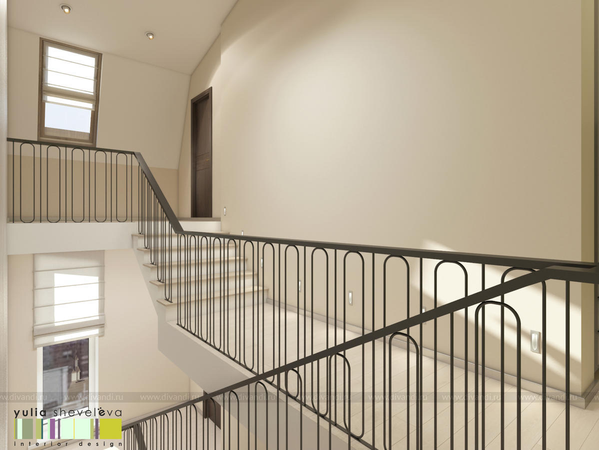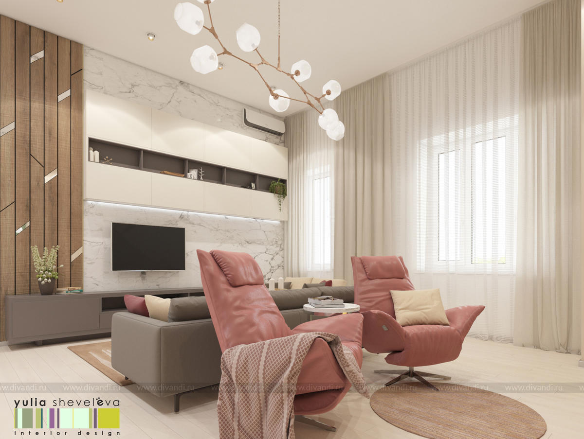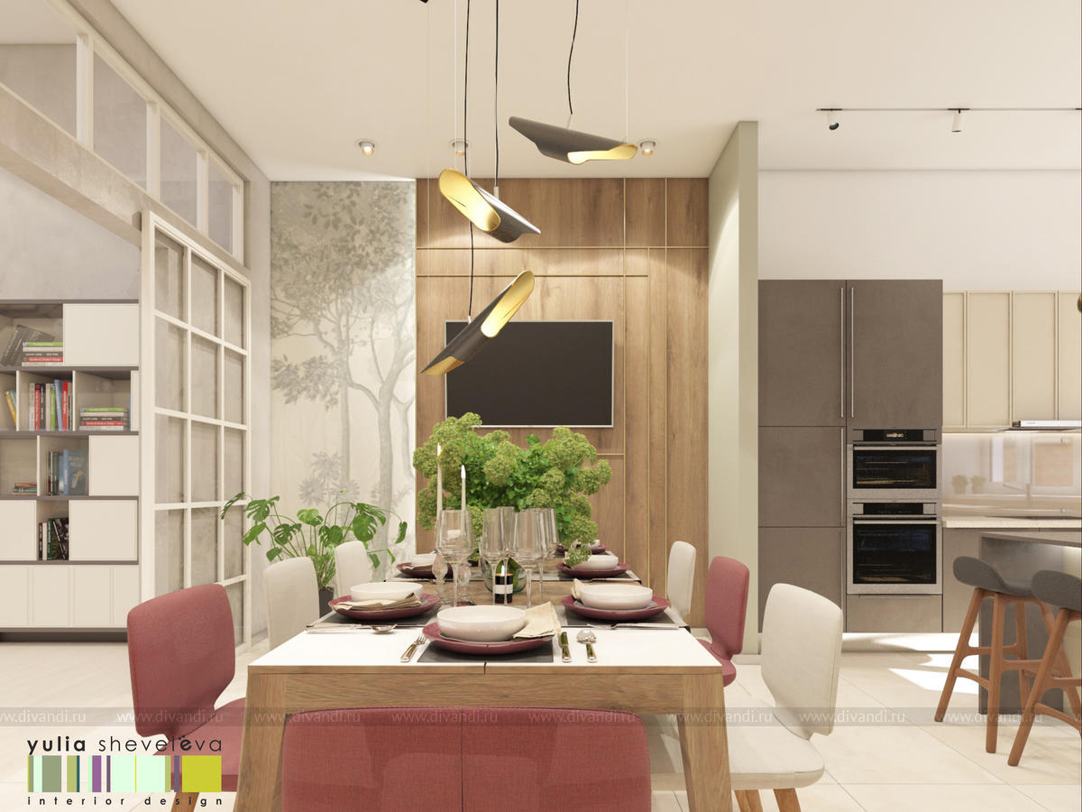 Интерьер дома было решено выполнить в современном стиле, с яркими акцентами и не перегруженного деталями в то же время. На первом этаже расположились гостиная и кухня, гостевой санузел. Здесь очень хорошая высота потолка - около четырёх метров, очень хотелось ее подчеркнуть красивыми интерьерными решениями. Так появились деревянные панели с зеркальными вставками и панно, имитирующее натуральный мрамор. Кухня-столовая спряталась за раздвижными дверцами.